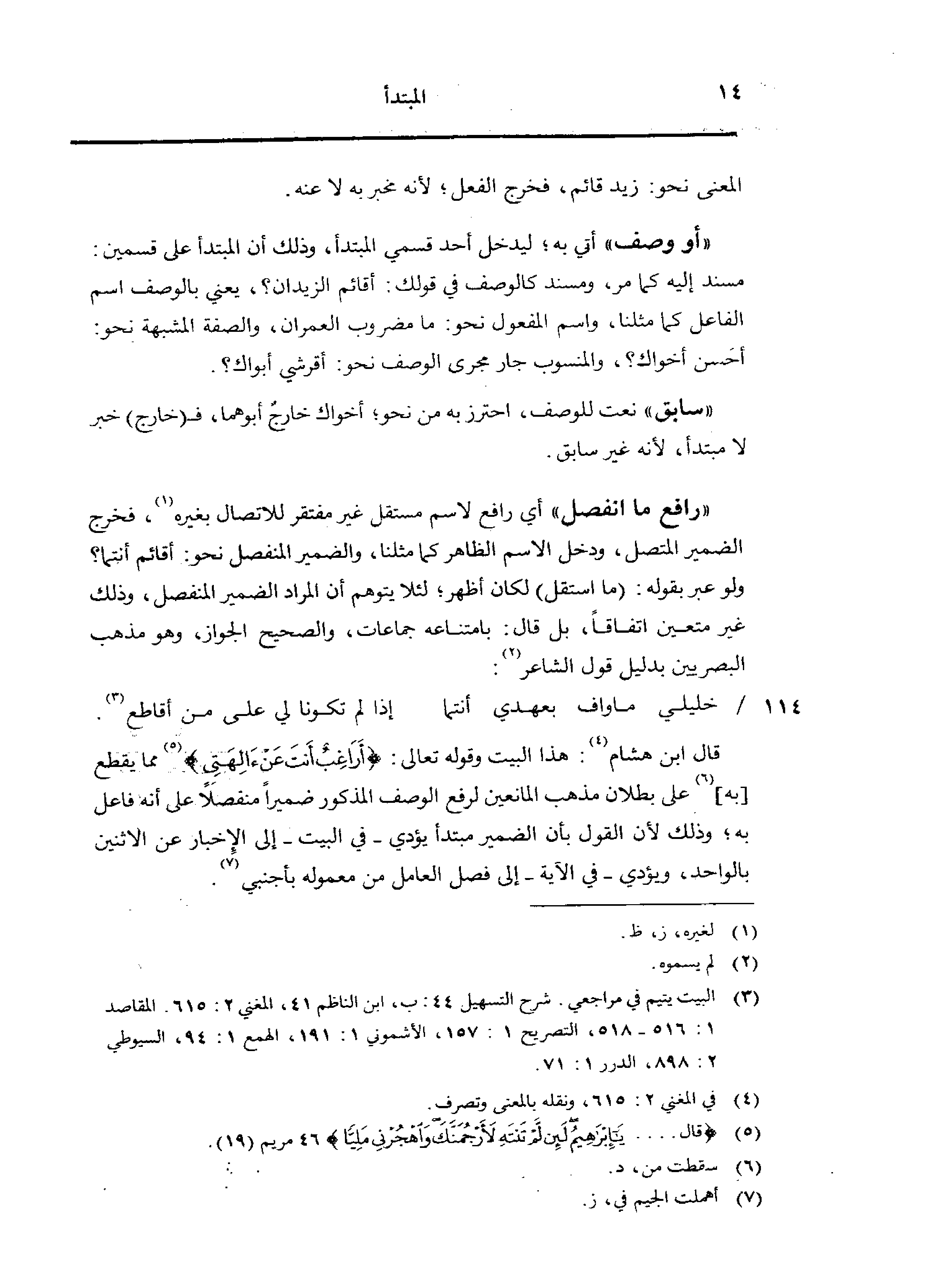 قال ابن هشام: هذا البيت وقوله تعالى: {أراغب أنت عن ألهتي} مما يقطع [به] على بطلان مذهب المانعين لرفع الوصف المذكور ضميرًا منفصلًا على أنه فاعل به؛ وذلك لأن القول بأن الضمير مبتدأ يؤدي - في البيت - إلى الإخبار عن الاثنين بالواحد، ويؤدي - في الآية - إلى فصل العامل من معموله بأجنبي.