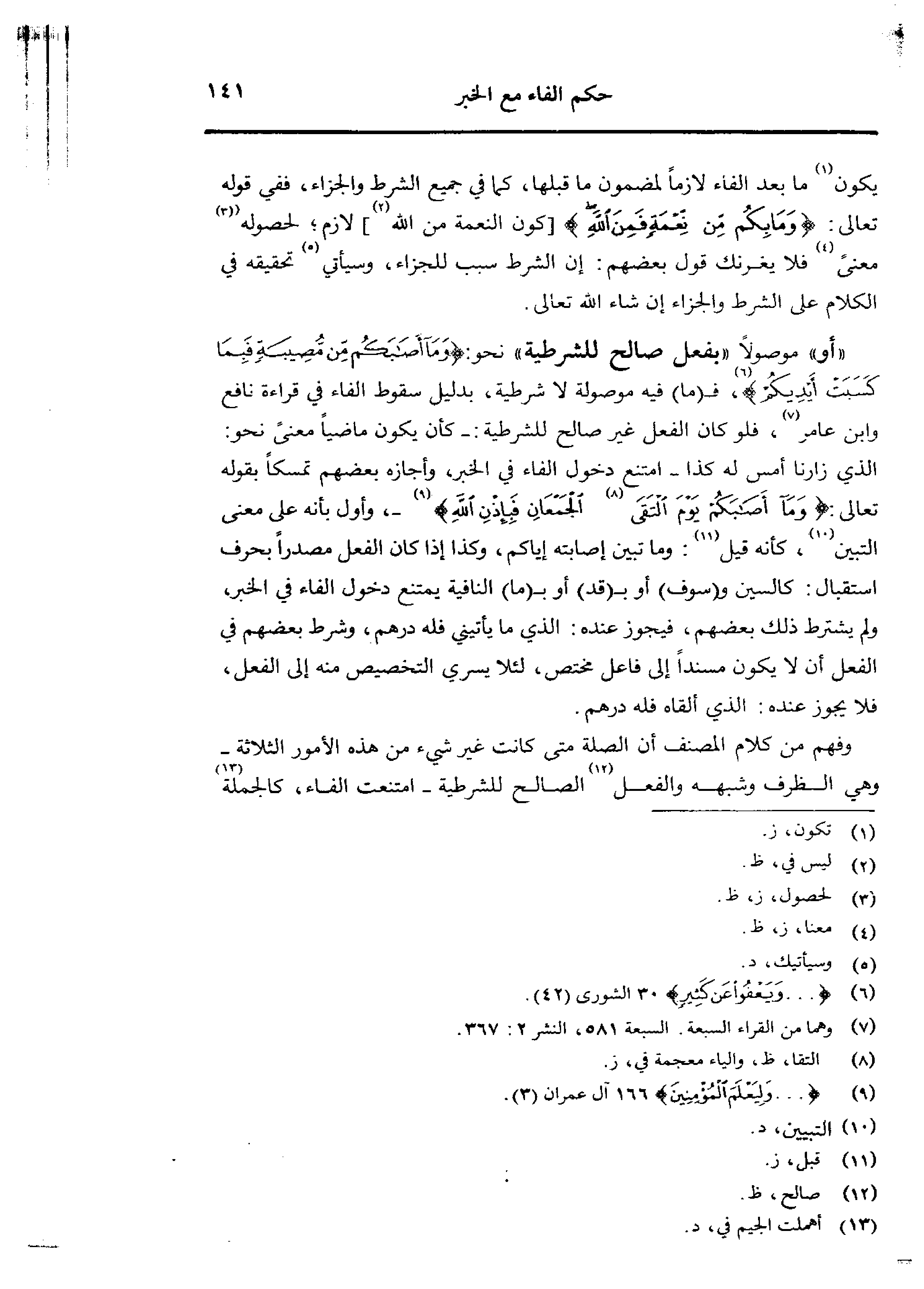 «أو» موصولًا «بفعل صالح للشرطية» نحو: {وما أصابكم من مصيبة فبما كسبت أيديكم}، فـ ـ (ما) فيه موصولة لا شرطية، بدليل سقوط الفاء في قراءة نافع وابن عامر فلو كان الفعل غير صالح للشرطية: - كأن يكون ماضيًا معنى نحو: الذي زارنا أمس له كذا - امتنع دخول الفاء في الخبر، وأجازه بعضهم تمسكًا بقوله تعالى: {وما أصابكم يوم التقى الجمعان فبإذن الله} -، وأول بأنه على معنى التبين، كأنه قيل: وما تبين إصابته إياكم، وكذا إذا كان الفعل مصدرًا بحرف استقبال: كالسين و (سوف) أو بـ ـ ـ (قد) أو بـ ـ ـ (ما) النافية يمتنع دخول الفاء في الخبر، ولم يشترط ذلك بعضهم، فيجوز عنده: الذي ما يأتيني فله درهم، وشرط بعضهم في الفعل أن لا يكون مسندًا إلى فاعل مختص، لئلا يسري التخصيص منه إلى الفعل، فلا يجوز عنده: الذي ألقاه فله درهم.