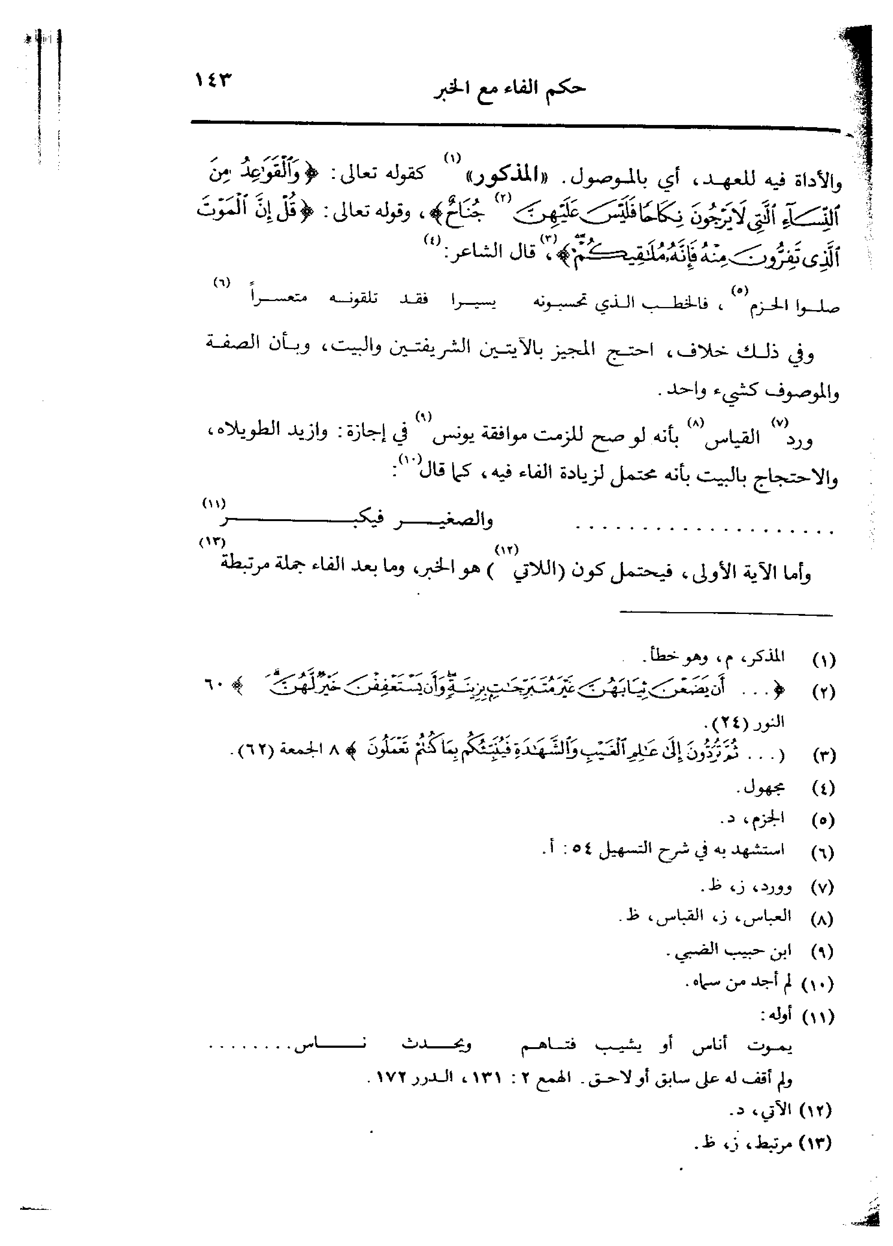 والأداة فيه للعهد، أي بالموصول. «المذكور» كقوله تعالى: {والقواعد من النساء التي لا يرجون نكاحًا فليس عليهن جناح}، وقوله تعالى: {قل إن الموت الذي تفرون منه فإنه ملقيكم}، قال الشاعر: