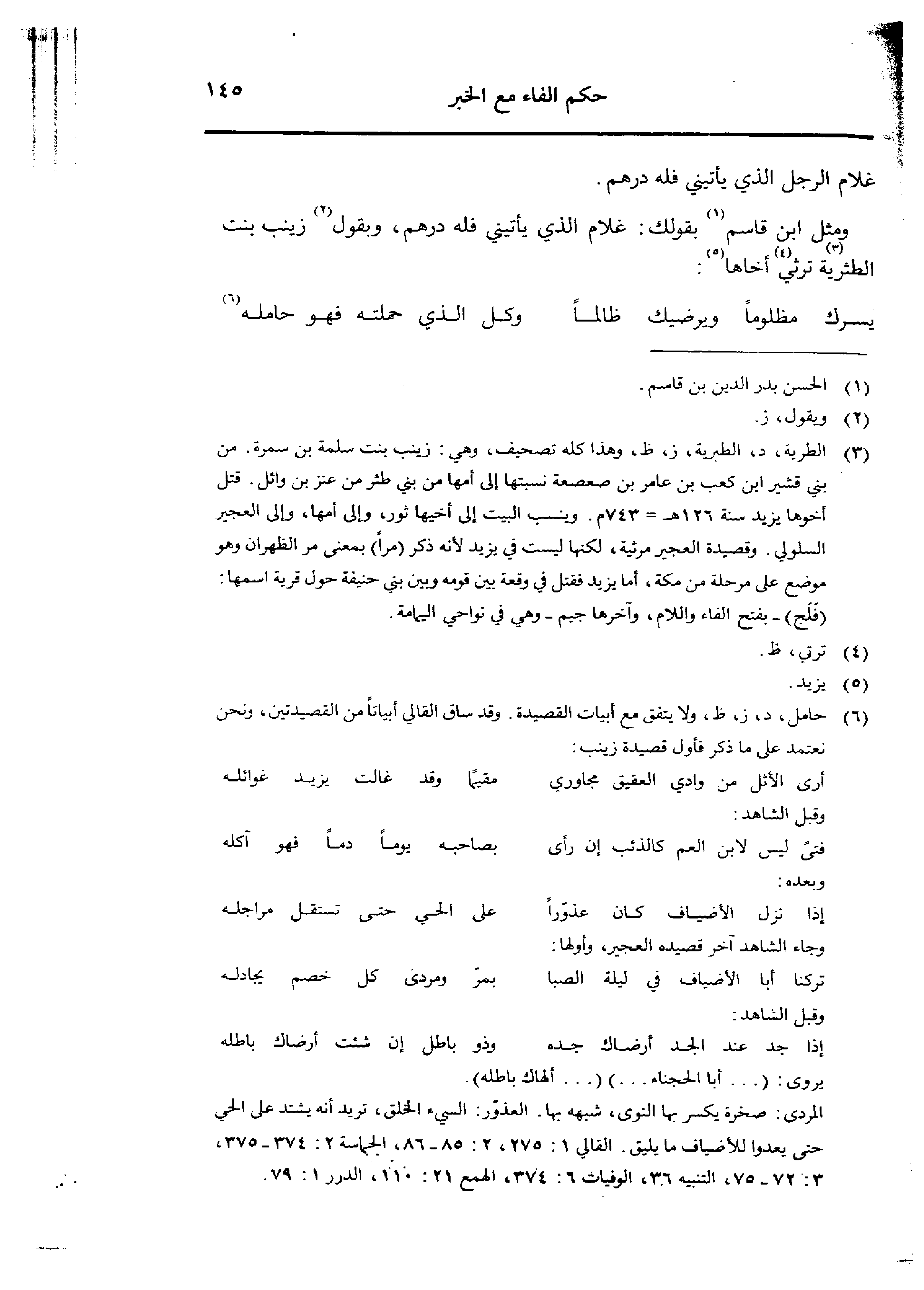 ومثل ابن قاسم بقولك: غلام الذي يأتيني فله درهم، وبقول زينب بنت الطثرية ترثي أخاها:
