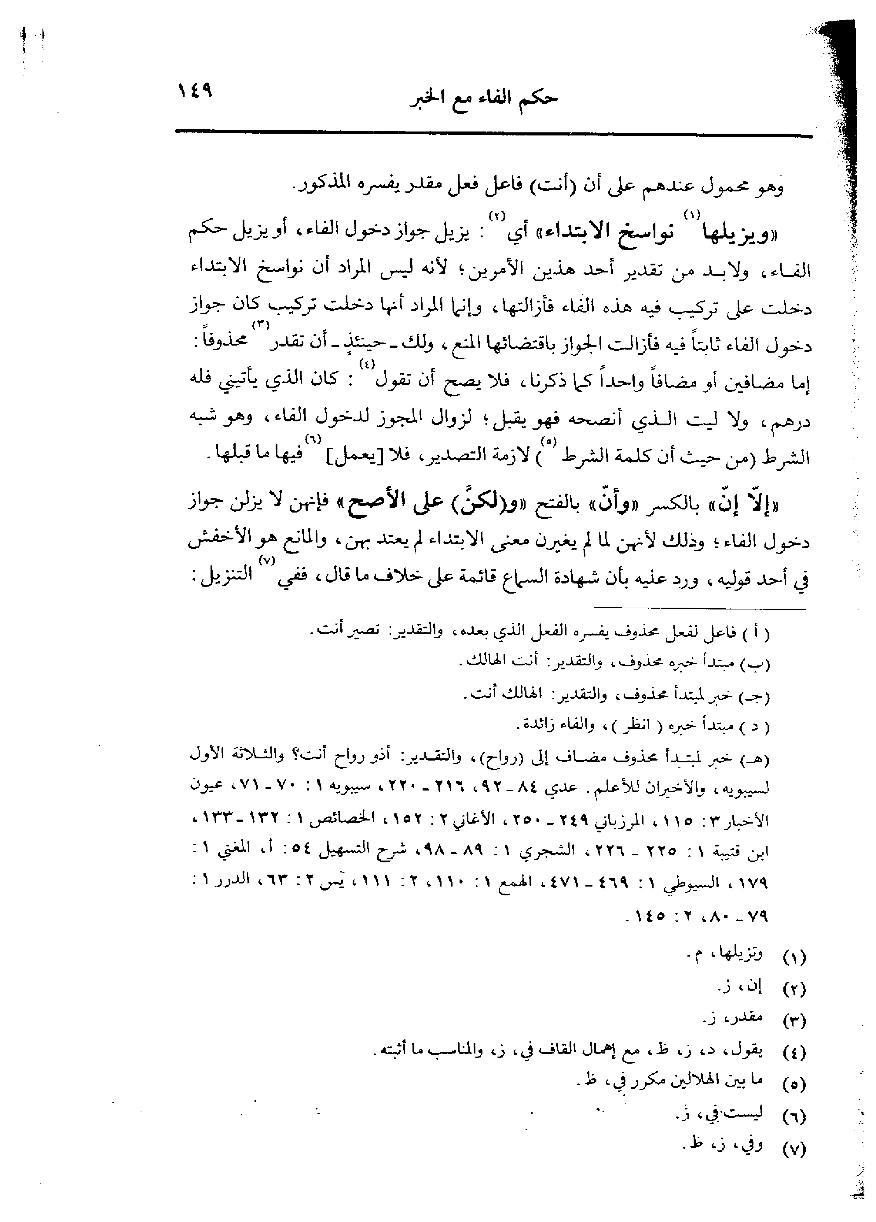 «ويزيلها نواسخ الابتداء» أي: يزيل جواز دخول افاء، أو يزيل حكم الفاء، ولابد من تقدير أحد هذين الأمرين؛ لأنه ليس المراد أن نواسخ الابتداء دخلت على تركيب فيه هذه الفاء فأزالتها، وإنما المراد أنها دخلت تركيب كان جواز دخول الفاء ثابتًا فيه فأزالت الجواز باقتضائها المنع، ولك - حينئذ - أن تقدر محذوفًا: إما مضافين أو مضافًا واحدًا كما ذكرنا، فلا يصح أن تقول: كان الذي يأتيني فله درهم، ولا ليت الذي أنصحه فهو يقبل؛ لزوال المجوز لدخول الفاء، وهو شبه الشرط (من حيث أن كلمة الشرط) لازمة التصدير، فلا [يعمل] فيها ما قبلها.