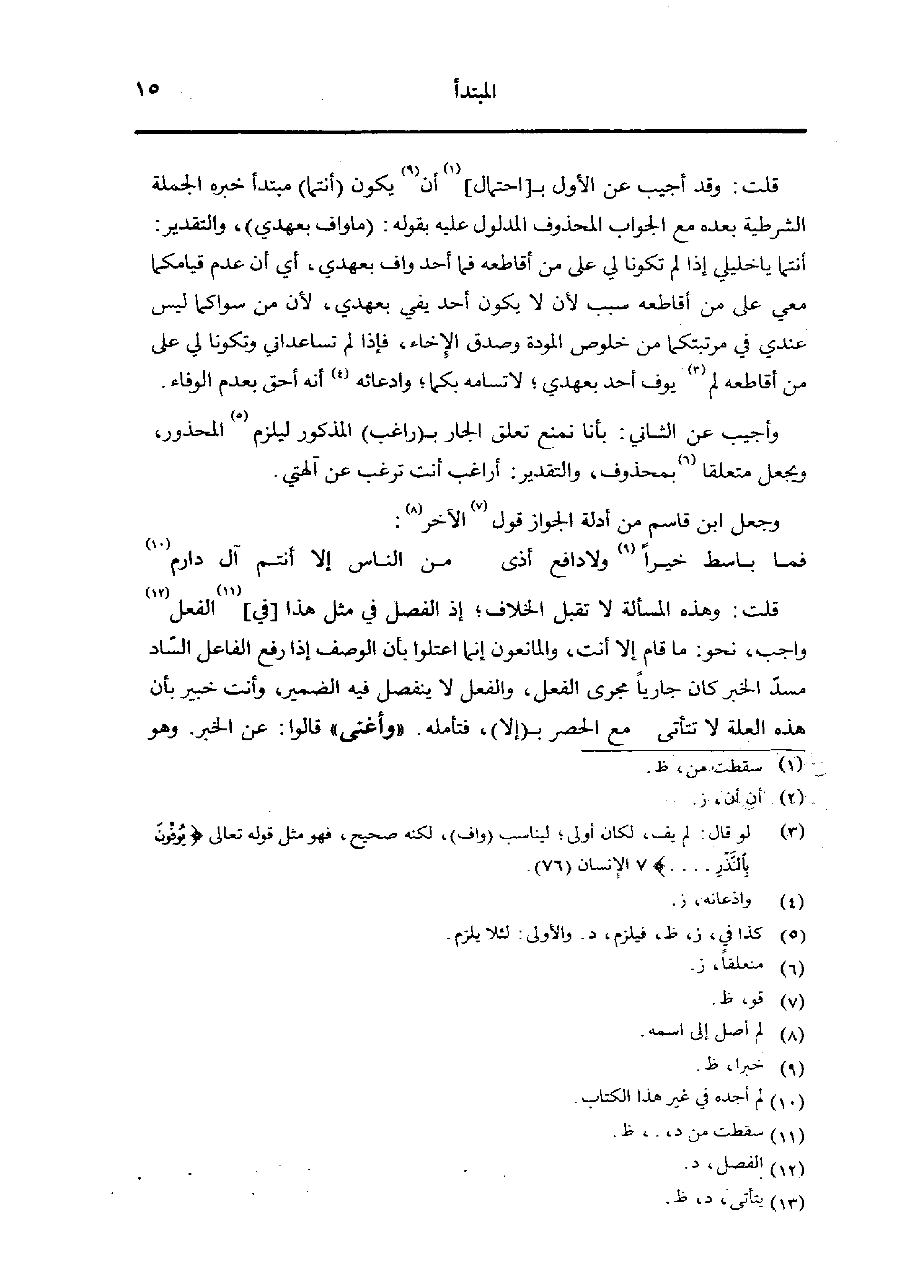 قلت: وقد أجيب عن الأول ب [احتمال] أن يكون [أنتما] مبتدأ خبره الجملة الشرطية بعده مع الجواب المحذوف المدلول عليه بقوله: (ما واف بعهدي)، والتقدير: أنتما يا خليلي إذا لم تكونا لي على من أقاطعه فما أحد واف بعهدي، أي أن عدم قيامكما معي على من أقاطعه سبب لأن لا يكون أحد يفي بعهدي، لأن من سواكما ليس عندي في مرتبتكما من خلوص المودة وصدق الإخاء، فإذا لم تساعداني وتكونا لي على من أقاطعه لم يوف أحد بعهدي؛ لا تسامه بكما؛ وادعائه أنه أحق بعدم الوفاء.