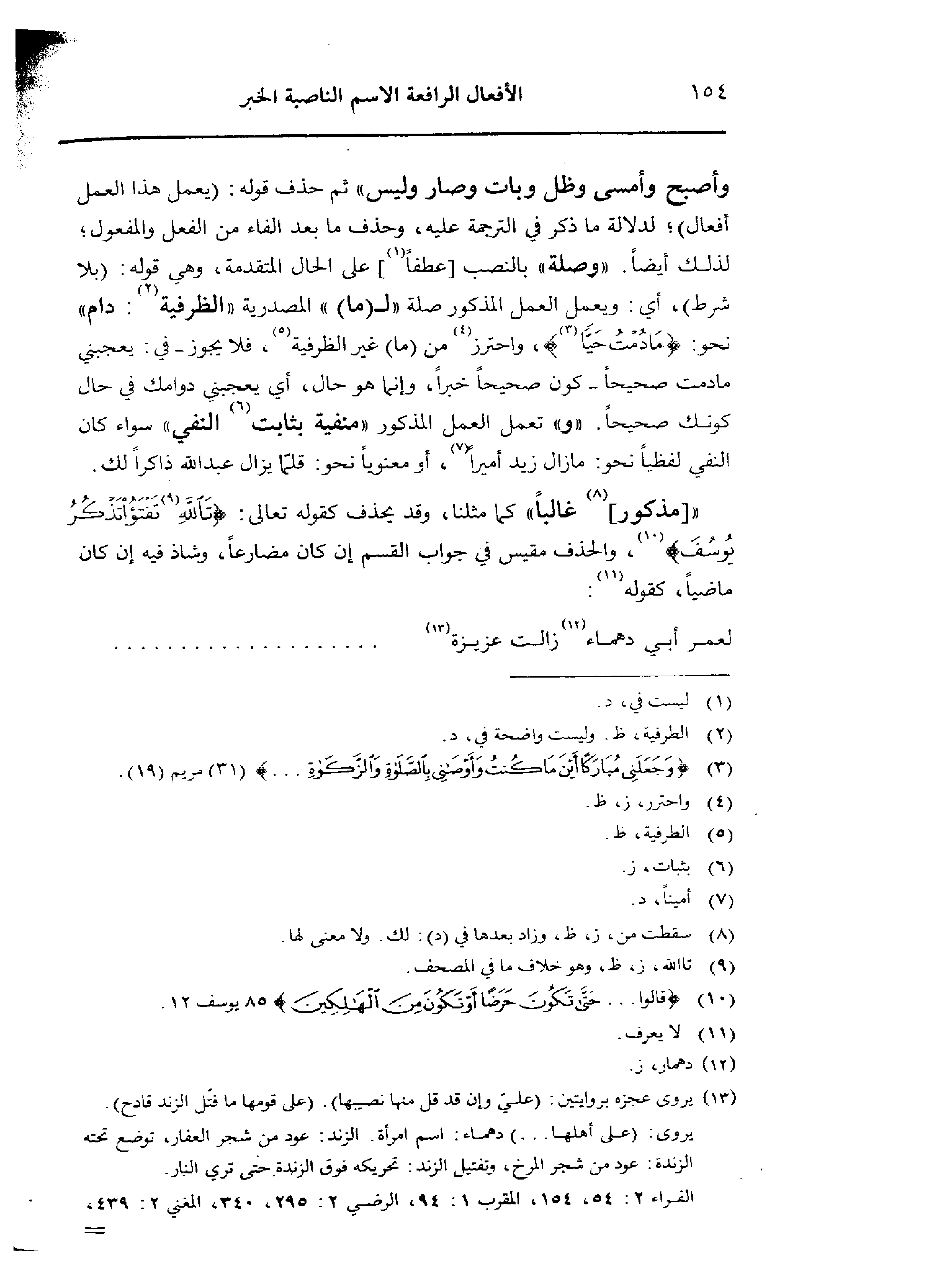 وأصبح وأمسى وظل وبات وصار وليس» ثم حذف قوله: (يعمل هذا العمل أفعال)؛ لدلالة ما ذكر في الترجمة عليه، وحذف ما بعد الفاء من الفعل والمفعول؛ لذلك أيضًا. «وصلة» بالنصب [عطفًا] على الحال المتقدمة، وهي قوله: (بلا شرط)، أي: ويعمل العمل المذكور صلة «لـ ـ ـ (ما)» المصدرية «الظرفية: دام» نحو: {ما دمت حيًا}، واحترز من (ما) غير الظرفية، فلا يجوز - في: يعجبني ما دمت صحيحًا - كون صحيحًا خبرًا، وإنما هو حال، أي يعجبني دوامك في حال كونك صحيحًا. «و» تعمل العمل المذكور «منفية بثابت النفي» سواء كان النفي لفظيًا نحو: ما زال زيد أميرًا، أو معنويًا نحو: قلما يزال عبد الله ذاكرًا لك.
