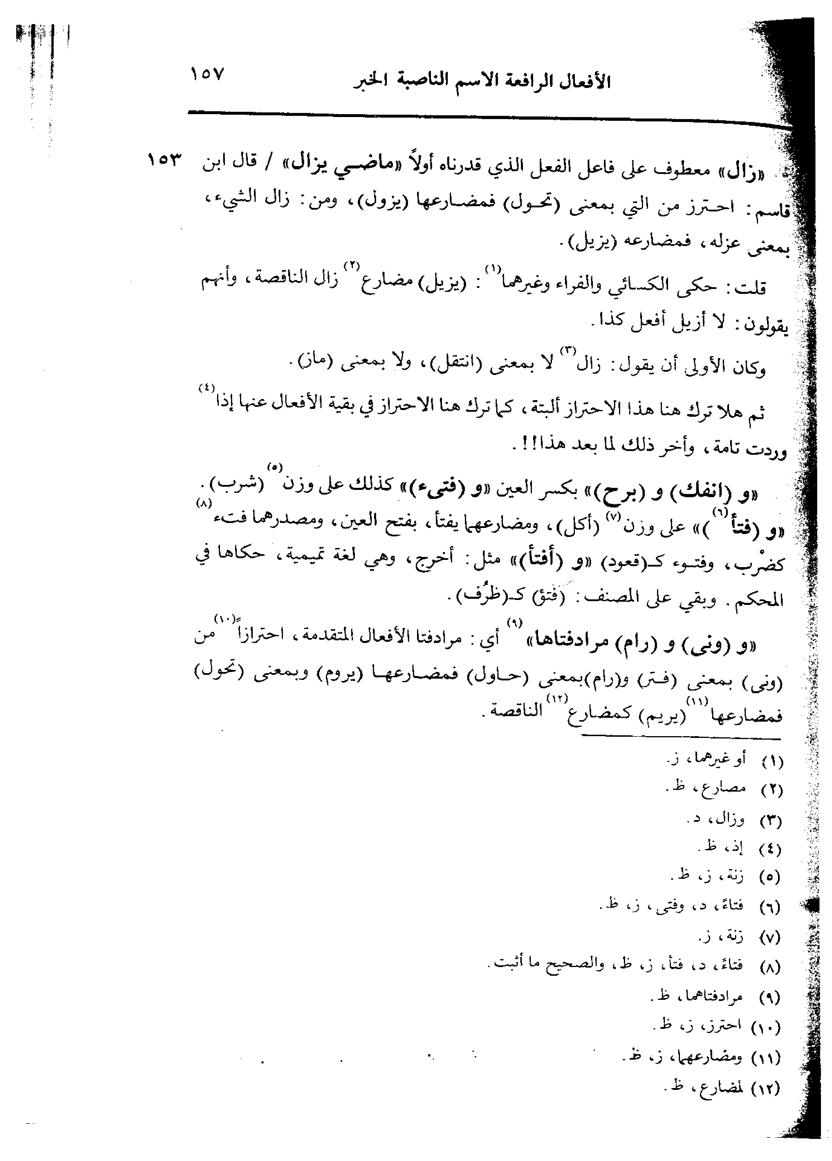 «زال» معطوف على فاعل الفعل الذي قدرناه أولًا «ماضي يزال» / قال ابن قاسم: احترز من التي بمعنى (تحول) فمضارعها (يزول)، ومن: (زال الشيء، بمعنى عزله، فمضارعه (يزيل).