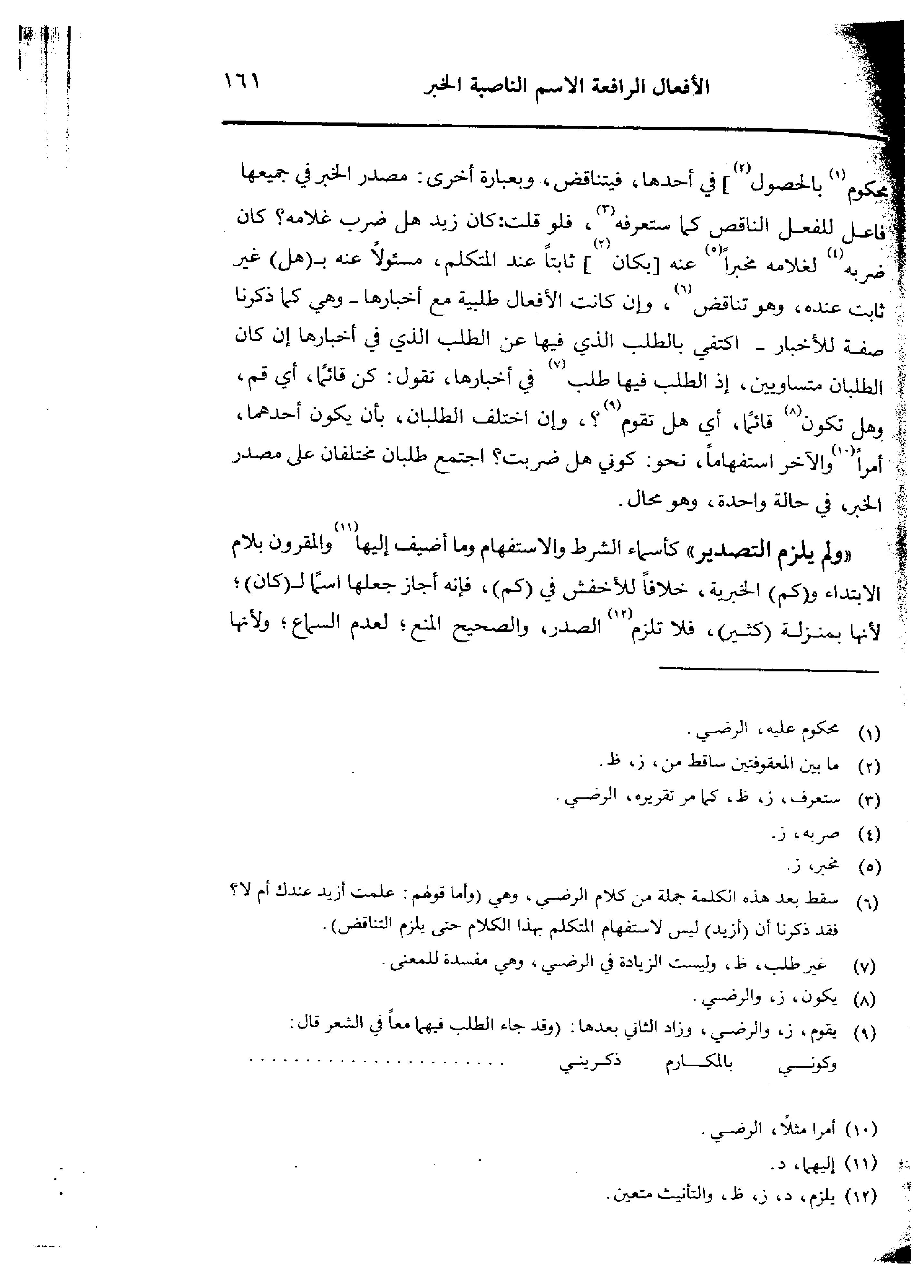محكوم بالحصول] في أحدها، فيتناقض، وبعبارة أخرى: مصدر الخبر في جميعها فاعل للفعل الناقص كما ستعرفه، فلو قلت: كان زيد هل ضرب غلامه؟ كان ضربه لغلامه مخبرًا عنه [بكان] ثابتًا عند المتكلم، مسئولًا عنه بـ ـ ـ (هل) غير ثابت عنده، وهو تناقض، وإن كانت الأفعال طلبية مع أخبارها، وهي كما ذكرا صفة للأخبار - اكتفي بالطلب الذي فيها عن الطلب الذي في أخبارها إن كان الطلبان متساويين، إذ الطلب فيها طلب في أخبارها، تقول: كن قائمًا، أي قم، وهل تكون قائمًا، أي هل تقوم؟ ، وإن اختلف الطلبان، بأن يكون أحدهما، أمرًا والآخر استفهامًا، نحو: كوني هل ضربت؟ اجتمع طلبان مختلفان على مصدر الخبر، في حالة واحدة، وهو محال.