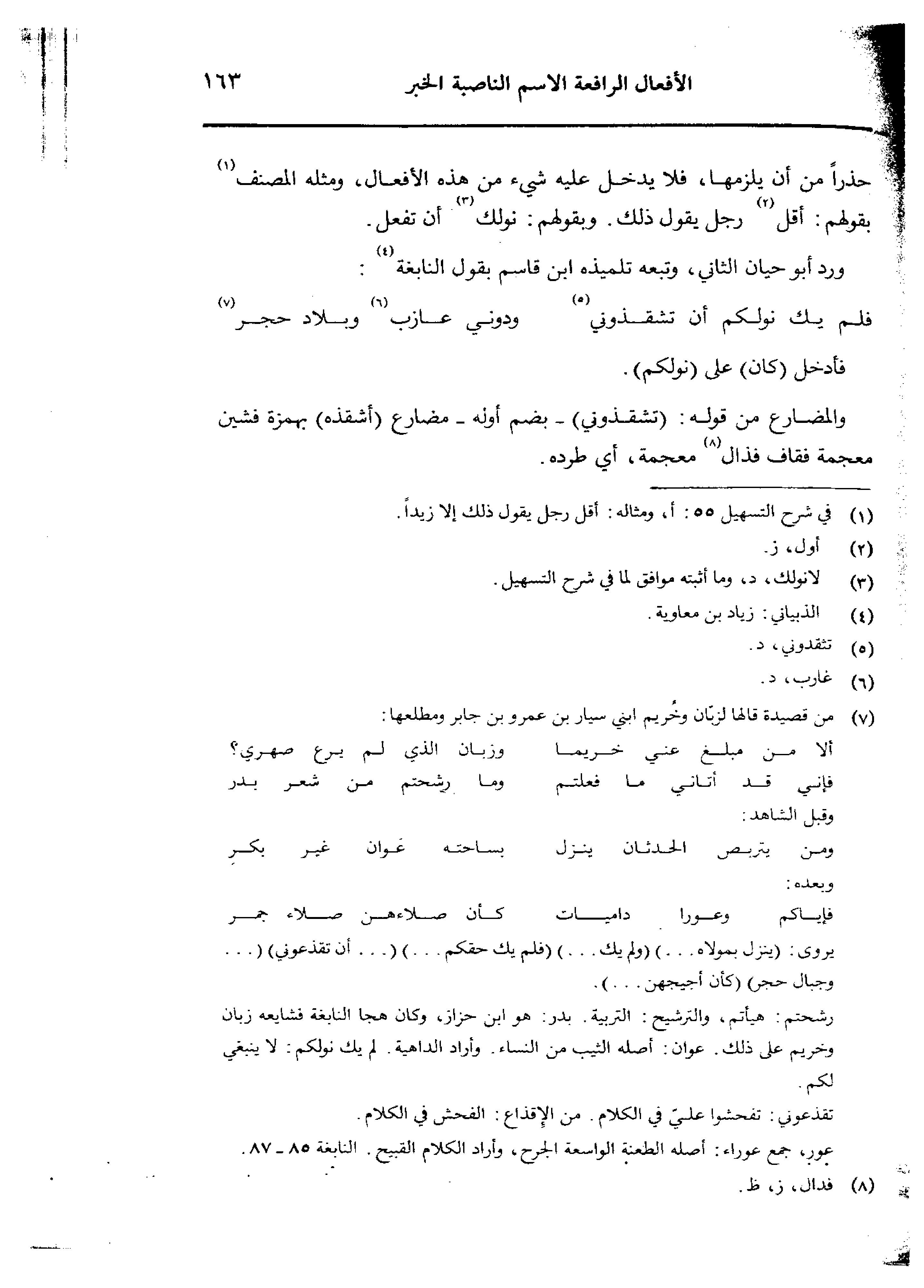 حذرًا من أن يلزمها، فلا يدخل عليه شيء من هذه الأفعال، ومثله المصنف بقولهم: أقل رجل يقول ذلك. وبقولهم: نولك أن تفعل. ورد أبو حيان الثاني، وتبعه تلميذه ابن قاسم بقول النابغة: