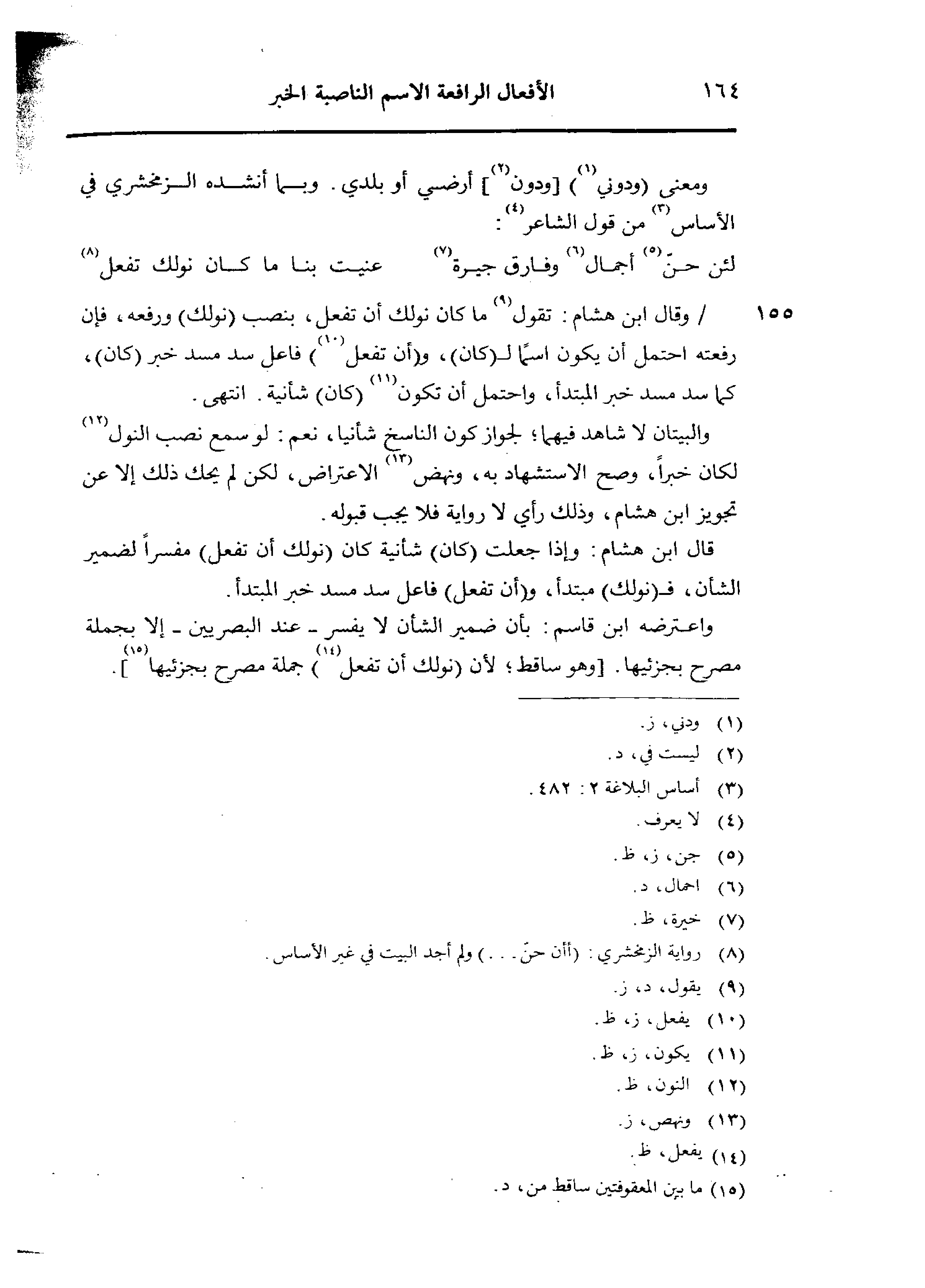 واعترضه ابن قاسم: بأن ضمير الشأن لا يفسر - عند البصريين - إلا بجملة مصرح بجزئيها. [وهو ساقط؛ لأن (نولك أن تفعل) جملة مصرح بجزئيها].