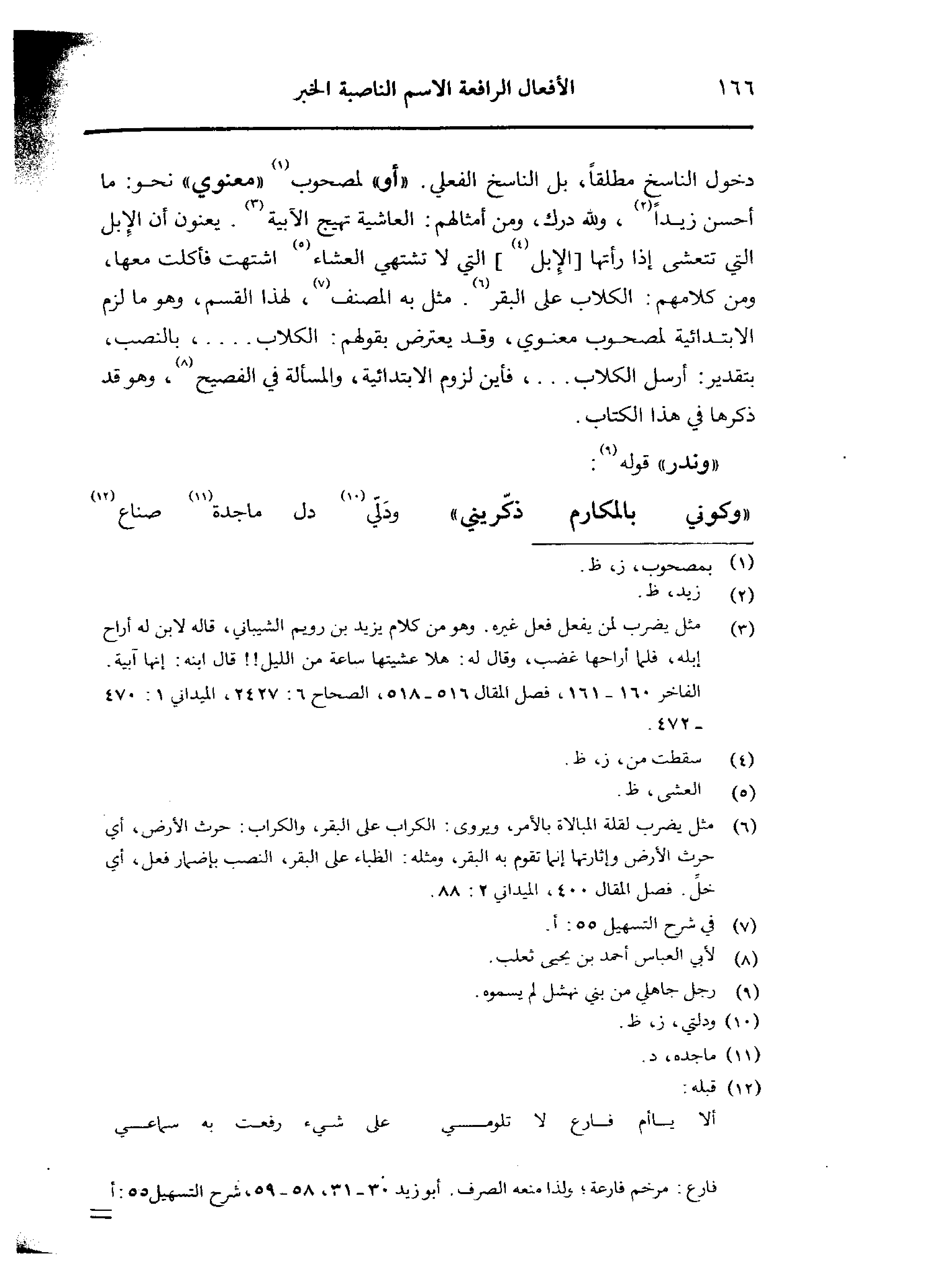 دخول الناسخ مطلقًا، بل الناسخ الفعلي. «أو» لمصحوب «معنوي» نحو: ما أحسن زيدًا، ولله درك ومن أمثالهم: العاشية تهيج الآبية. يعنون أن الإبل التي تتعشي إذا رأتها [الإبل] التي لا تشتهي العشاء اشتهت فأكلت معها، ومن كلامهم: الكلاب على البقر. مثل به المصنف، لهذا القسم، وهو ما لزم الابتدائية لمصحوب معنوي، وقد يعترض بقولهم: الكلاب ..... ، بالنصب، بتقدير: أرسل الكلاب .... ، فأين لزوم الابتدائية، والمسألة في الفصيح، وهو قد ذكرها في هذا الكتاب.