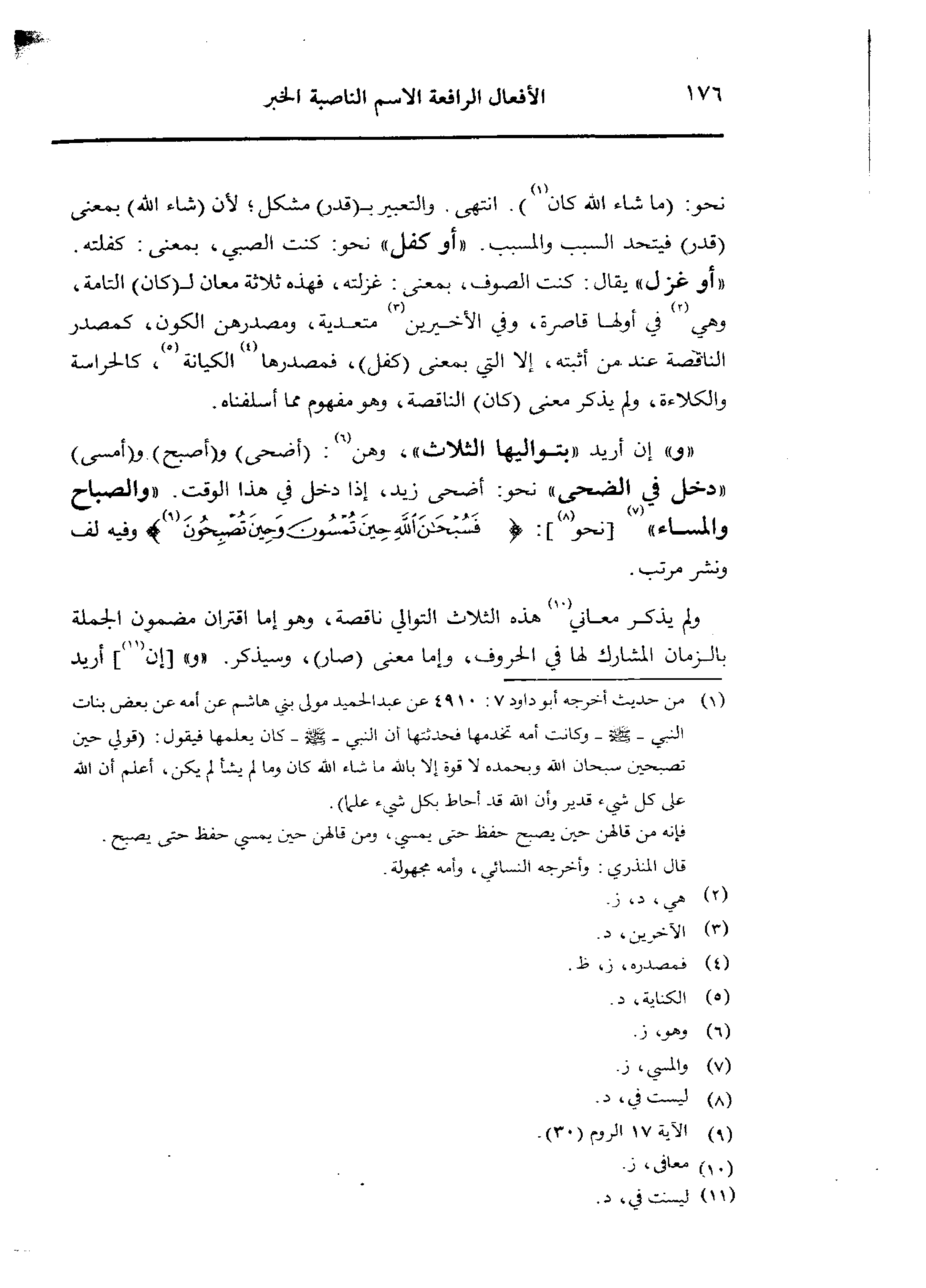 ولم يذكر معاني هذه الثلاث التوالي ناقصة، وهو إما اقتران مضمون الجملة بالزمان المشارك لها في الحروف، وإما معنى (صار)، وسيذكر. «و» [إن] أريد