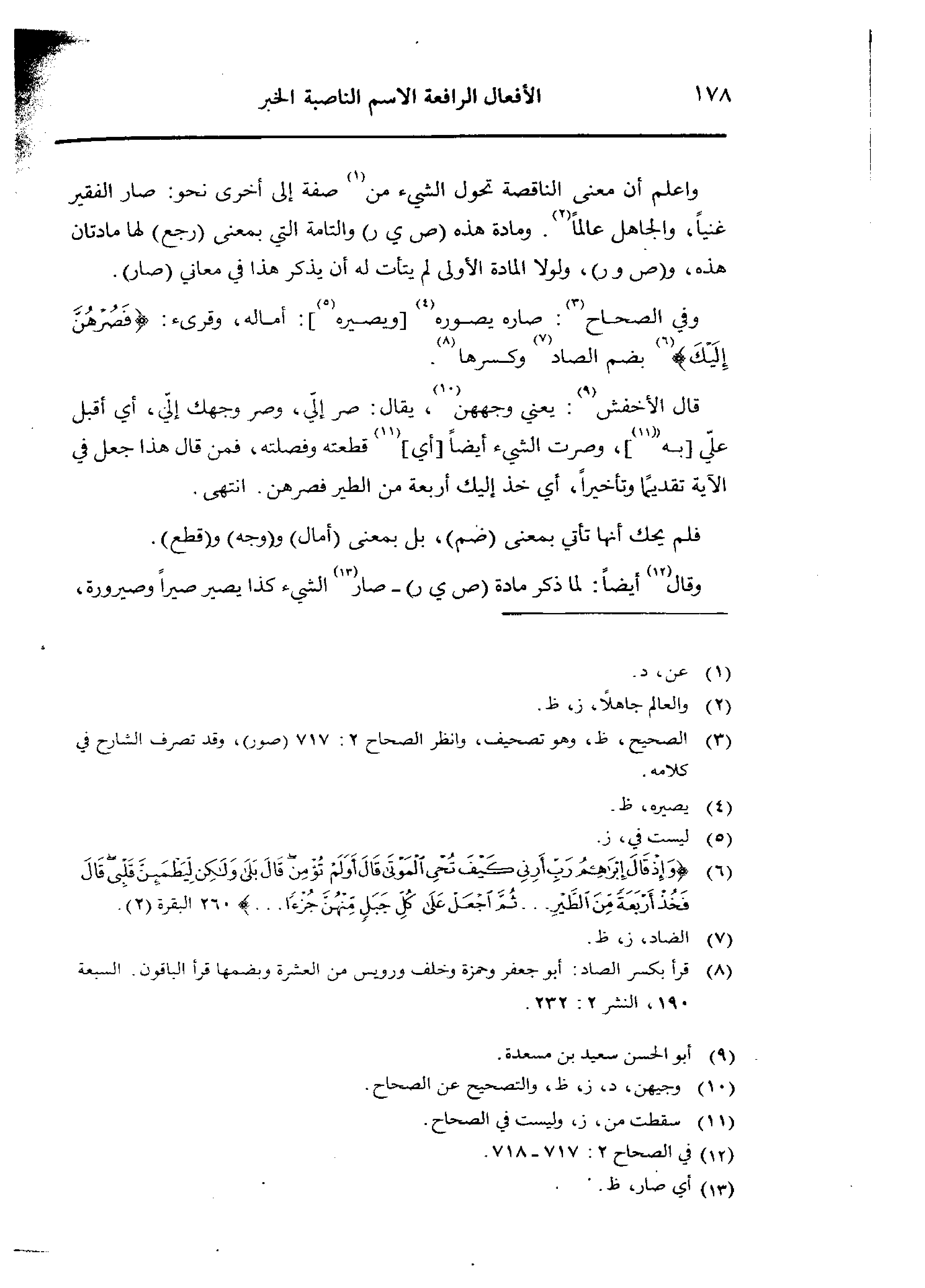 واعلم أن معنى الناقصة تحول الشيء من صفة إلى أخرى نحو: صار الفقير غنيًا، والجاهل عالمًا. ومادة هذه (ص ي ر) والتامة التي بمعنى (رجع) لها مادتان هذه، و (ص ور)، ولولا المادة الأولى لم يتأت له أن يذكر هذا في معاني (صار).