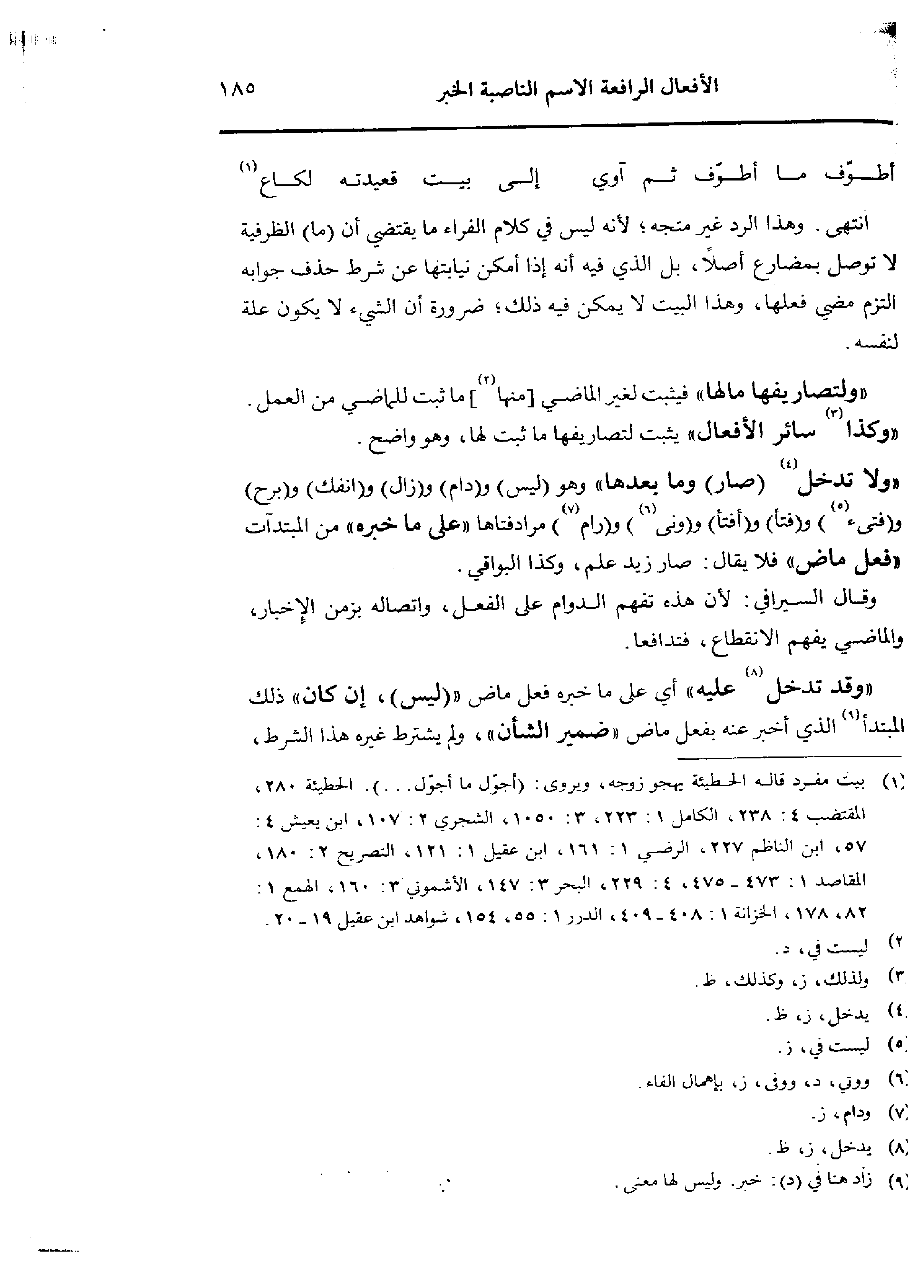 «ولا تدخل (صار) وما بعدها» وهو (ليس) ودام) و (زال) و (انفك) و (برح) و (فتيء) و (فتأ) و (ونى) و (رام) مرادفتاها «على ما خبره» من المبتدآت «فعل ماض» فلا يقال: صار زيد علم، وكذا البواقي.