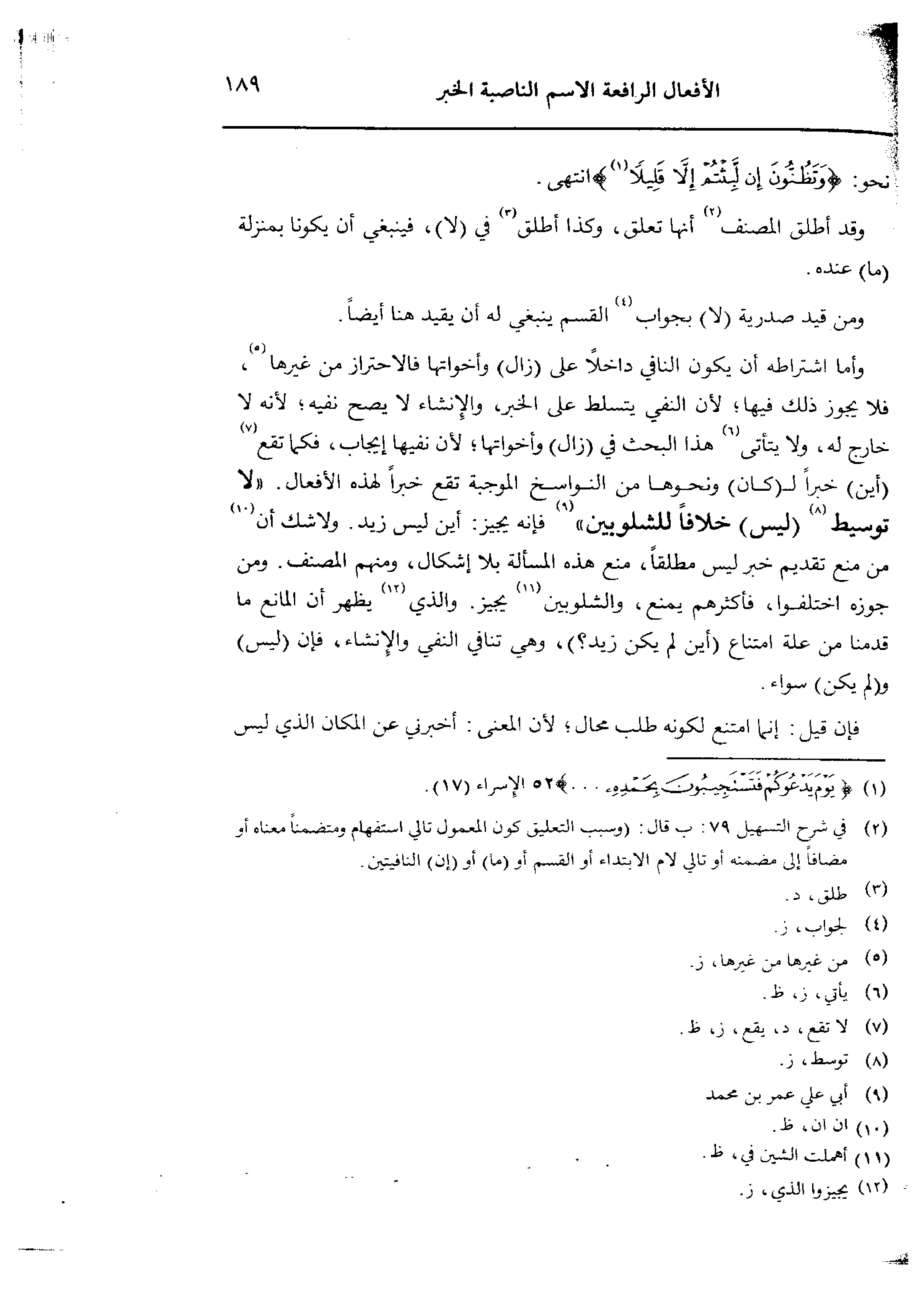 وما اشتراطه أن يكون النافي داخلًا على (زال) وأخواتها فالاحتراز من غيرها، فلا يجوز ذلك فيها؛ لأن النفي يتسلط على الخبر، والإنشاء لا يصح نفيه؛ لأنه لا خارج له، ولا يتأتى هذا البحث في (زال) وأخواتها؛ لأن نفيها إيجاب، فكما تقع (أين) خبرًا لـ ـ ت (كان) ونحوها من النواسخ الموجبة تقع خبرًا لهذه الأفعال. «لا توسيط (ليس) خلافًا للشلوبين» فإنه يجيز: أين ليس زيد. ولا شك أن من منع تقديم خبر ليس مطلقًا، منع هذا المسألة بلا إشكال، ومنهم المصنف. ومن جوزه اختلفوا، فأكثرهم يمنع، والشلوبين يجيز. والذي يظهر أن المانع ما قدمنا من علة امتناع (أين لم يكن زيد؟ )، وهي تنافي النفي والإنشاء، فإن (ليس) و (لم يكن) سواء.