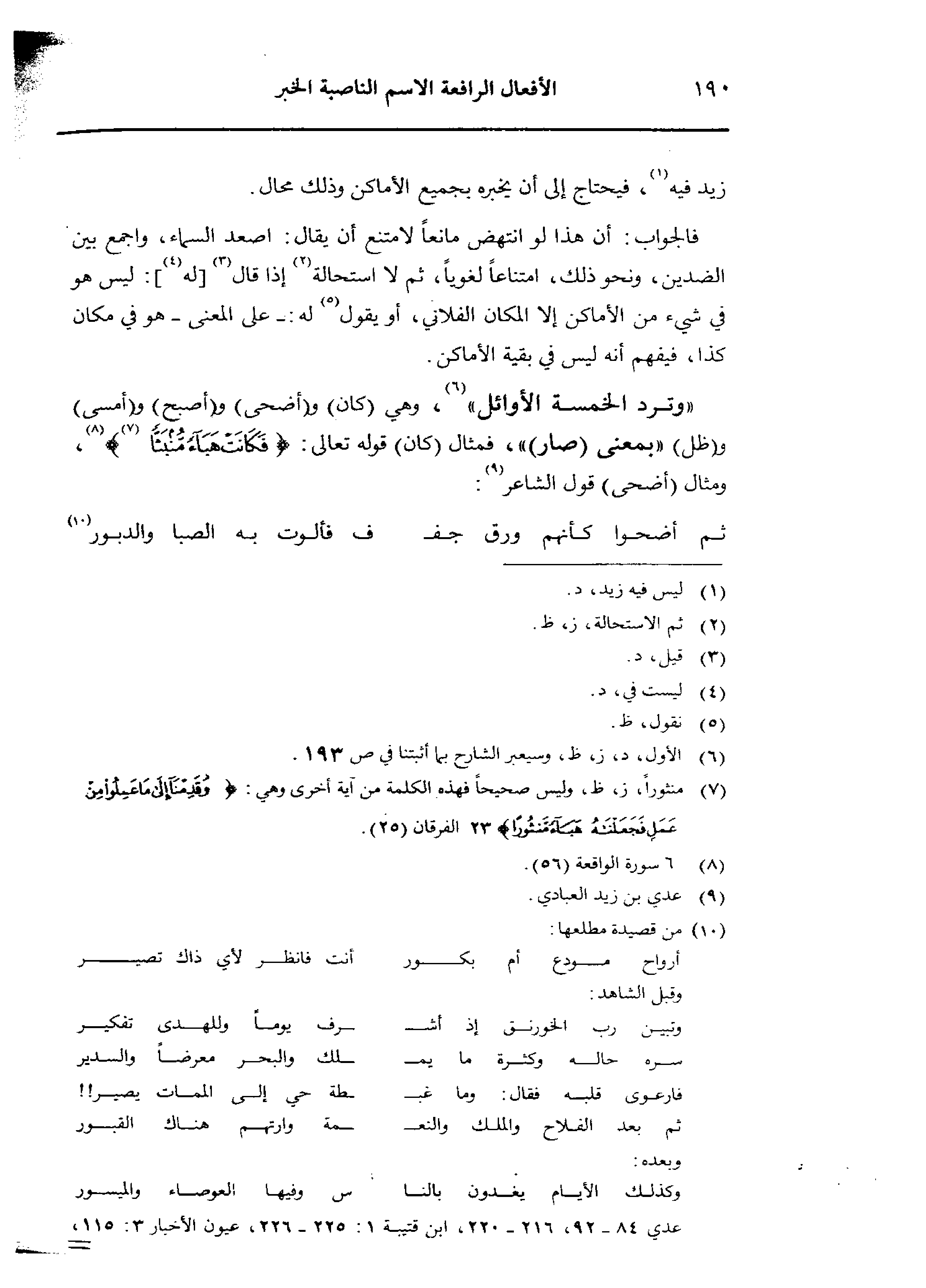 «وترد الخمسة الأوائل»، وهي (كان) و (أضحى) و (أصبح) و (أمسى) و (ظل) «بمعنى (صار)»، فمثال (كان) قوله تعالى: {فكانت هباء منبثًا}، ومثال (أضحى) قول الشاعر: