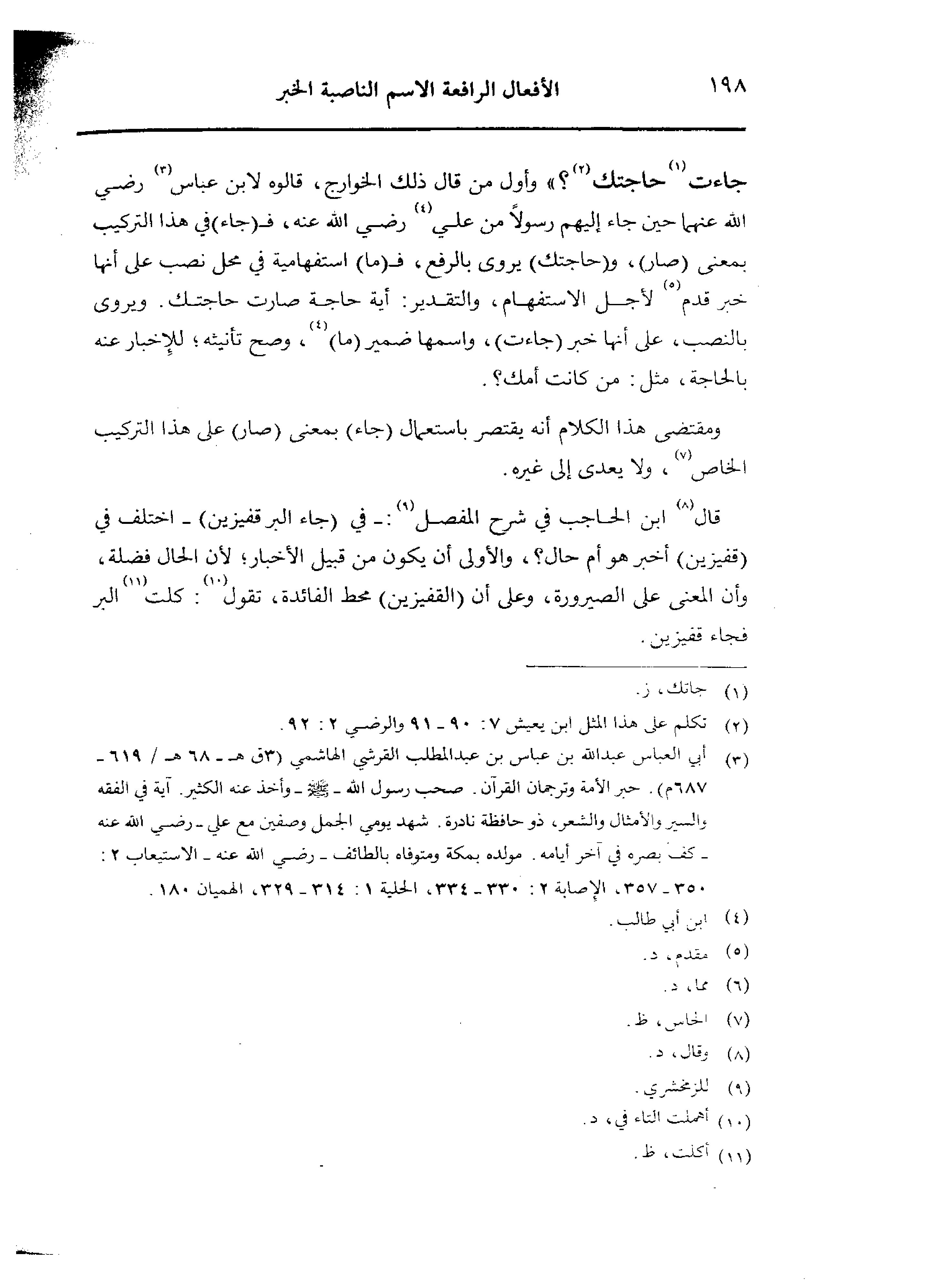 جاءت حاجتك؟ » وأول من قال ذلك الخوارج، قالوه لابن عباس رضي الله عنهما حين جاء إليهم رسولًا من علي رضي الله عنه، فـ ـ ـ (جاء) في هذا التركيب بمعنى (صار)، و (حاجتك) يروى بالرفع، فـ ـ ـ ما) استفهامية في محل نصب على أنها خبر قدم لأجل الاستفهام، والتقدير: أية حاجة صارت حاجتك. ويروى بالنصب، على أنها خبر (جاءت)، واسمها ضمير (ما)، وصح تأنيثه؛ للإخبار عنه بالحاجة، مثل: من كانت أمك؟ .