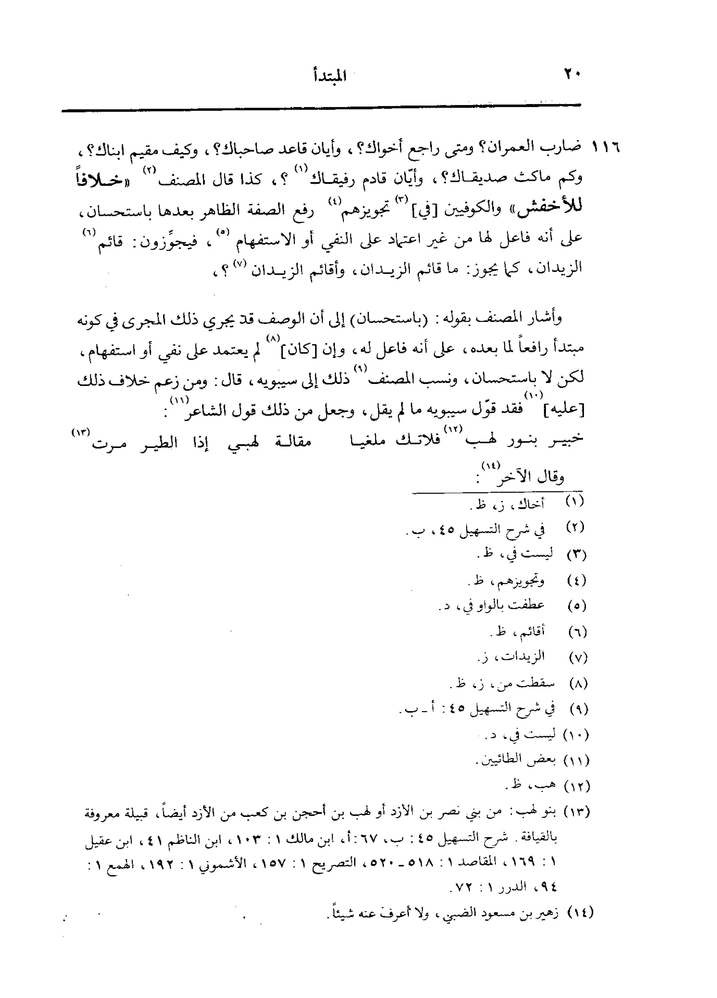 116 ضارب العمران؟ ومتى راجع أخواك؟ ، وأيان قاعد صاحباك؟ ، وكيف مقيم ابناك؟ ، وكم ماكث صديقاك؟ ، وأيان قادم رفيقاك؟ ، كذا قال المصنف «خلافًا للأخفش» والكوفيين [في] تجويزهم رفع الصفة الظاهر بعدها باستحسان، على أنه فاعل لها من غير اعتماد على النفي أو الاستفهام، فيجوزون: قائم الزيدان، كما يجوز: ما قائم الزيدان، وأقائم الزيدان؟ ، وأشار المصنف بقوله: (باستحسان) إلى أن الوصف قد يجري ذلك المجرى في كونه مبتدأ رافعًا لما بعده، على أنه فاعل له، وإن [كان] لم يعتمد على نفي أو استفهام، لكن لا باستحسان، ونسب المصنف ذلك إلى سيبويه، قال: ومن زعم خلاف ذلك [عليه] فقد قول سيبويه ما لم يقل، وجعل من ذلك قول الشاعر: