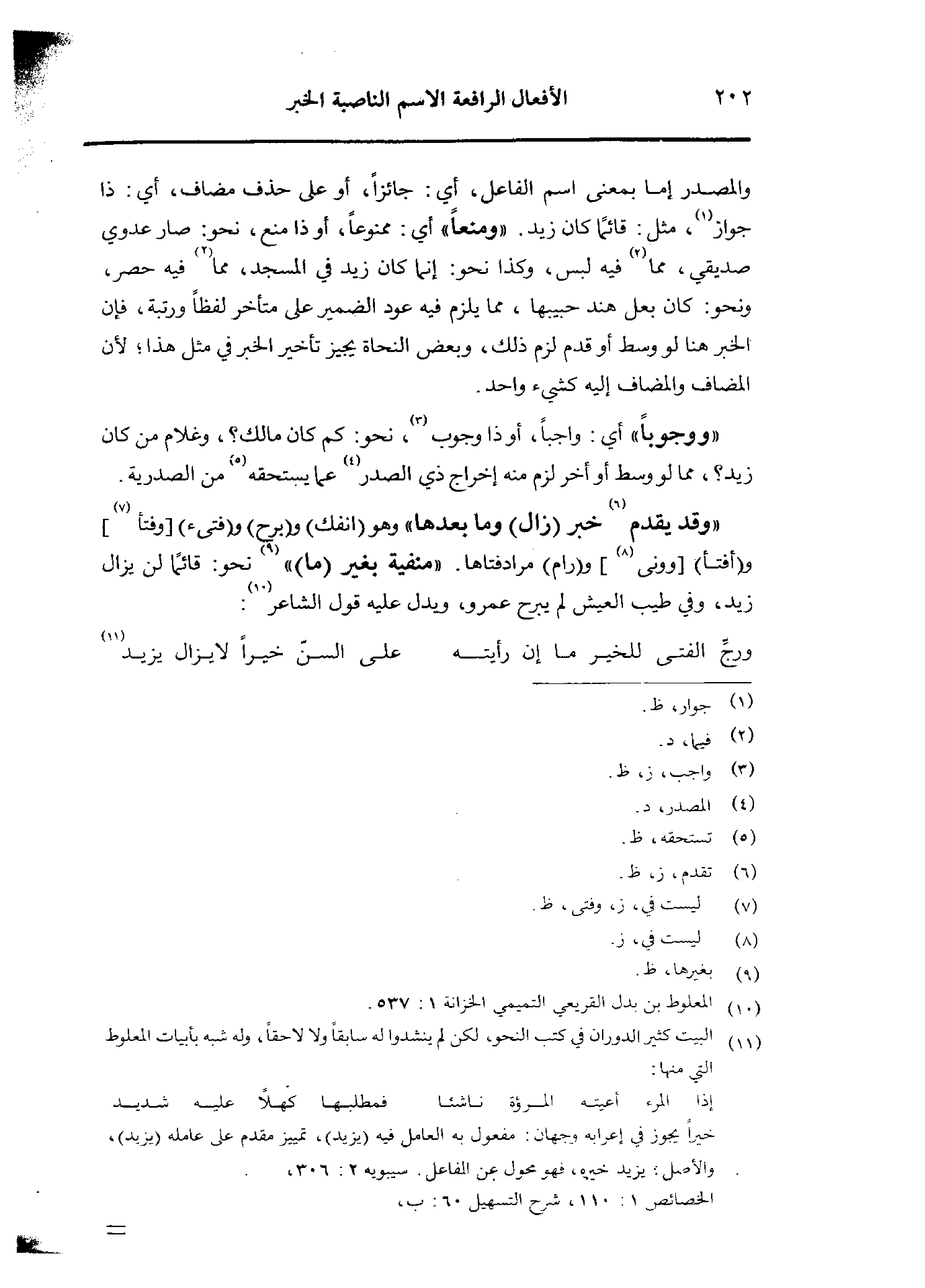 والمصدر إما بمعنى اسم الفاعل، أي: جائزًا، أو على حذف مضاف، أي: ذا جواز، مثل: قائمًا كان زيد. «ومنعًا» أي: ممنوعًا، أو ذا منع، نحو: صار عدوي صديقي، مما فيه لبس، وكذا نحو: إنما كان زيد في المسجد، مما فيه حصر، ونحو: كان بعل هند حبيبها، مما يلزم فيه عود الضمير على متأخر لفظًا ورتبة، فإن الخبر هنا لو وسط أو قدم لزم ذلك، وبعض النحاة يجيز تأخير الخبر في مثل هذا؛ لأن المضاف والمضاف إليه كشيء واحد.