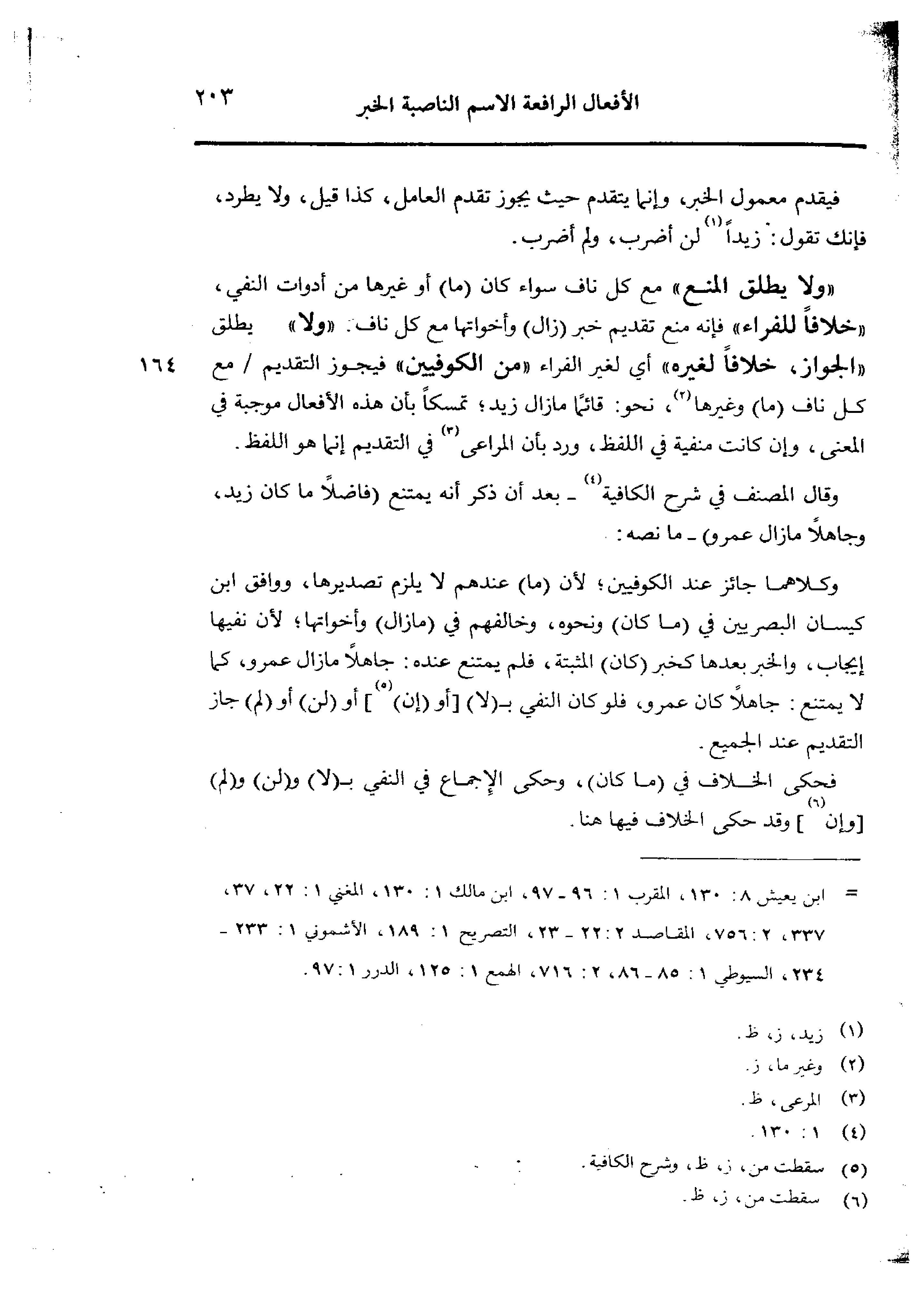 «ولا يطلق المنع» مع كل ناف سواء كان (ما) أو غيرها من أدوات النفي، «خلافا للفراء» فإنه منع تقديم خبر (زال) وأخواتها مع كل ناف «ولا» يطلق «الجواز، خلافًا لغيره» أي لغير الفراء «من الكوفيين» فيجوز التقديم/ مع كل ناف (ما) وغيرها، نحو: قائمًا ما زال زيد؛ تمسكًا بأن هذه الأفعال موجبة في المعنى، وإن كانت منفية في اللفظ، ورد بأن المراعى في التقديم إنما هو اللفظ.