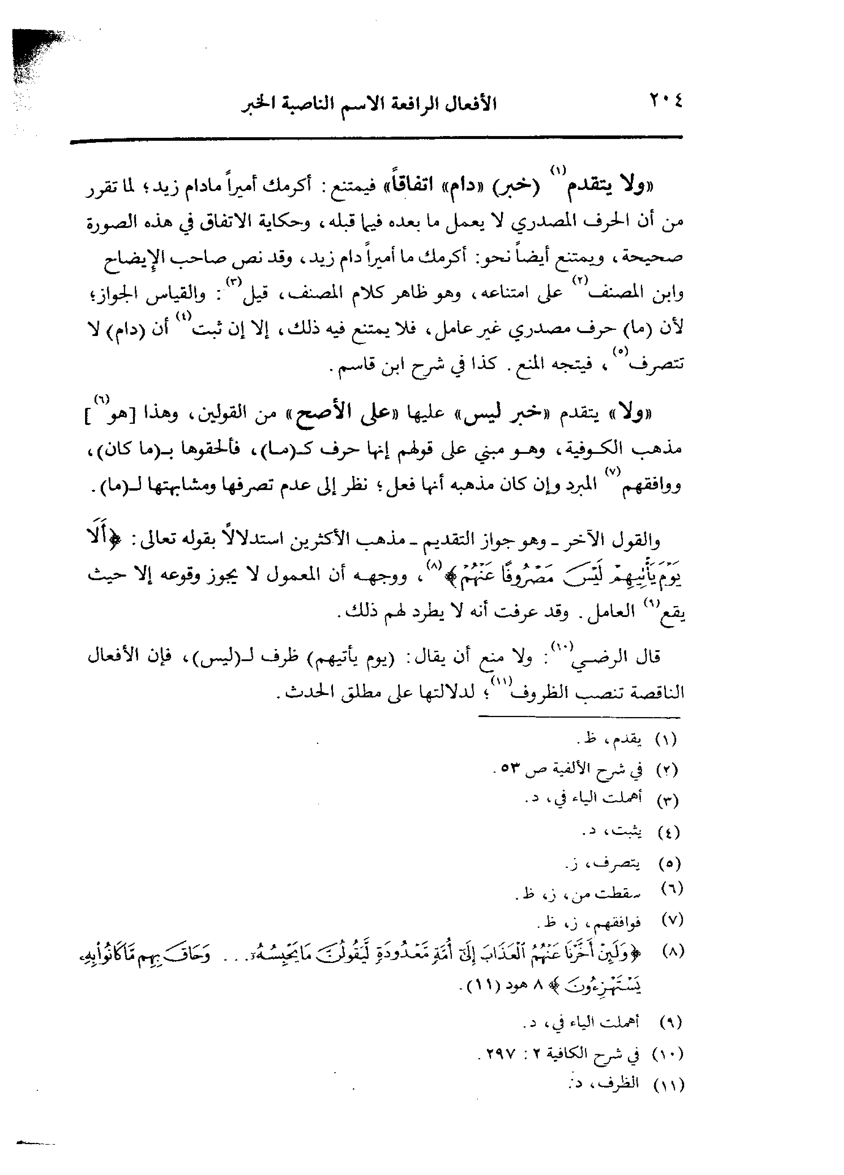 قال الرضي: ولا منع أن يقال: (يوم يأتيهم) ظرف لـ ـ ـ (ليس)، فإن الأفعال الناقصة تنصب الظروف؛ لدلالتها على مطلق الحدث.