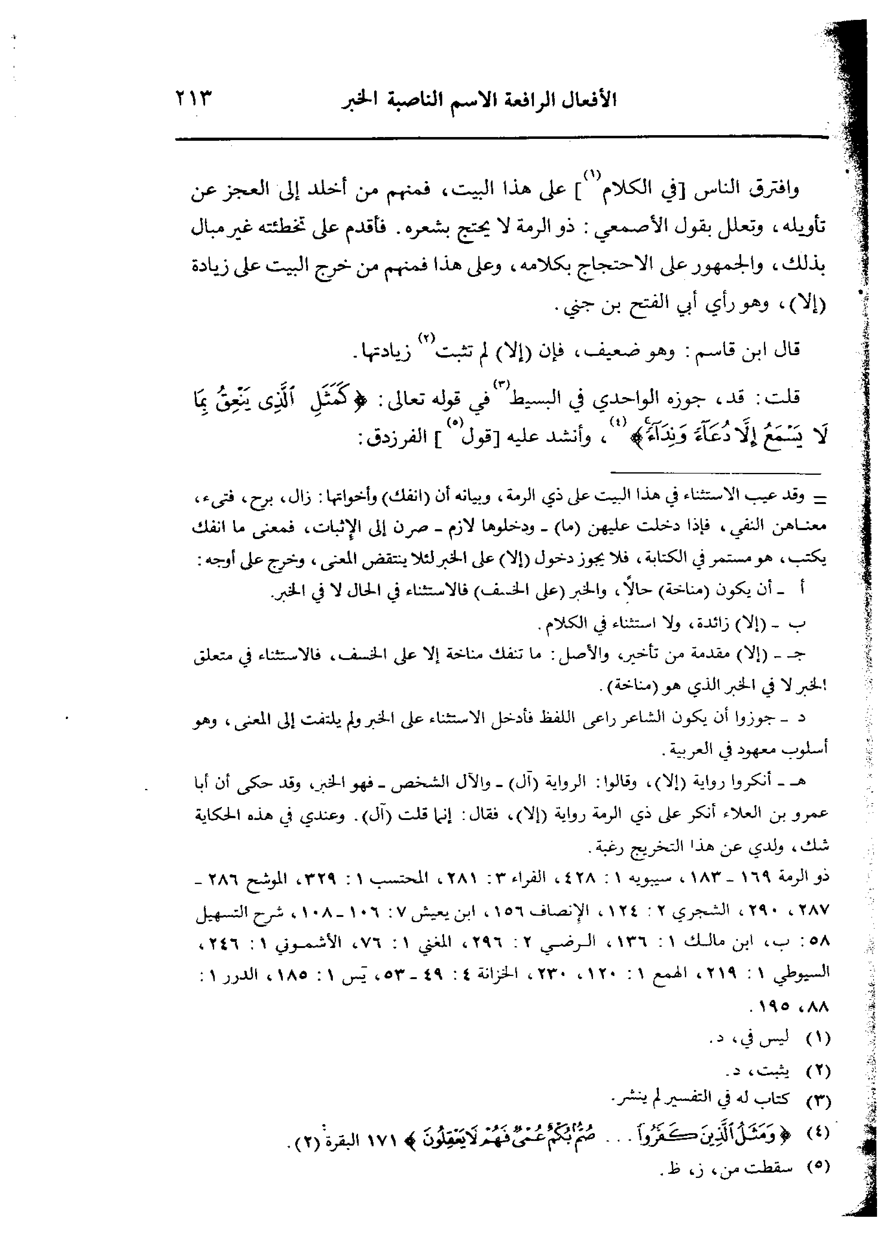 وافترق الناس [في الكلام] على هذا البيت، فمنهم من أخلد إلى العجز عن تأويله، وتعلل بقول الأصمعي: ذو الرمة لا يحتج بشعره. فأقدم على تخطئته غير مبال بذلك، والجمهور على الاحتجاج بكلامه، وعلى هذا فمنهم من خرج البيت على زيادة (إلا)، وهو رأي أبي الفتح بن جني.