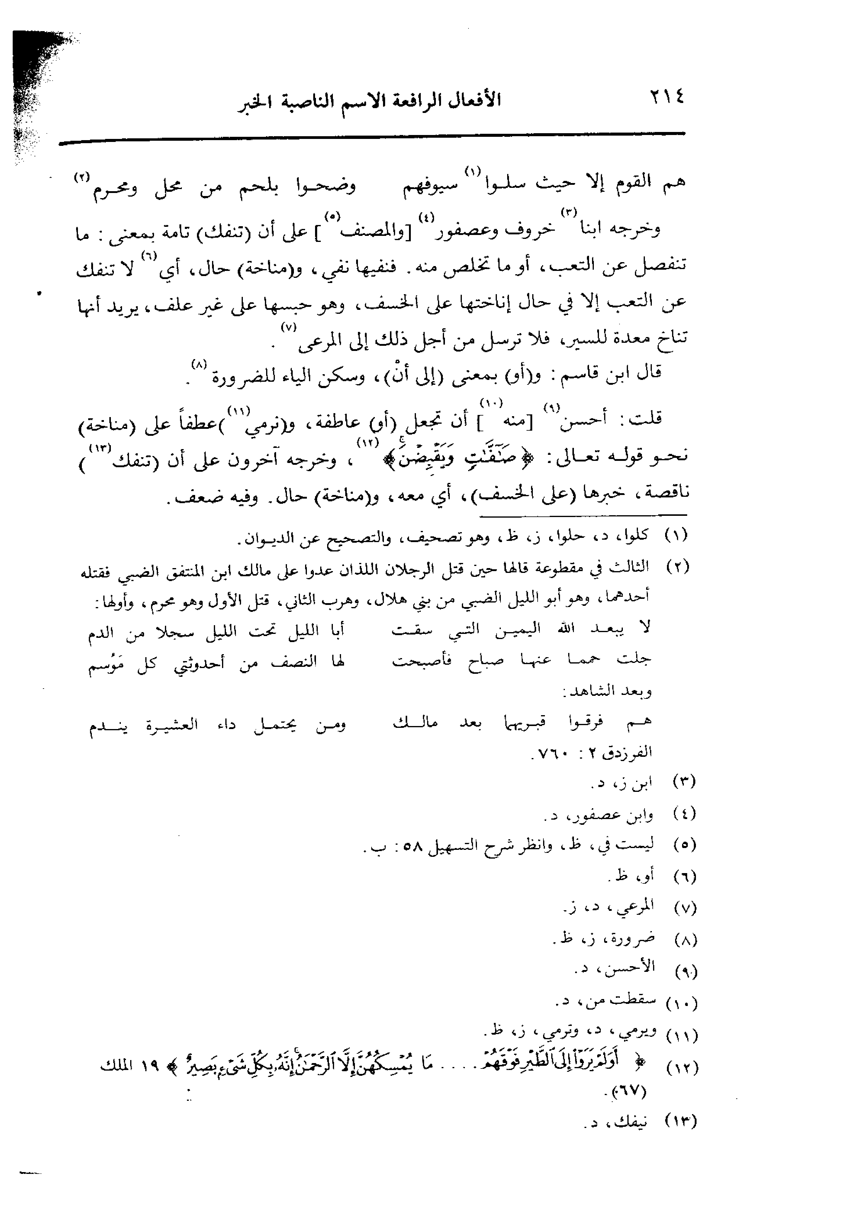 وخرجه ابنا خروف وعصفور [والمصنف] على أن (تنفك) تامة بمعنى: ما تنفصل عن التعب، أو ما تخلص منه. فنفيها نفي، و (مناخه) حال، أي لا تنفك عن التعب إلا في حال إناختها على الخسف، وهو حبسها على غير علف، يريد أنها تناخ معدة للسير، فلا ترسل من أجل ذلك إلى المرعى.