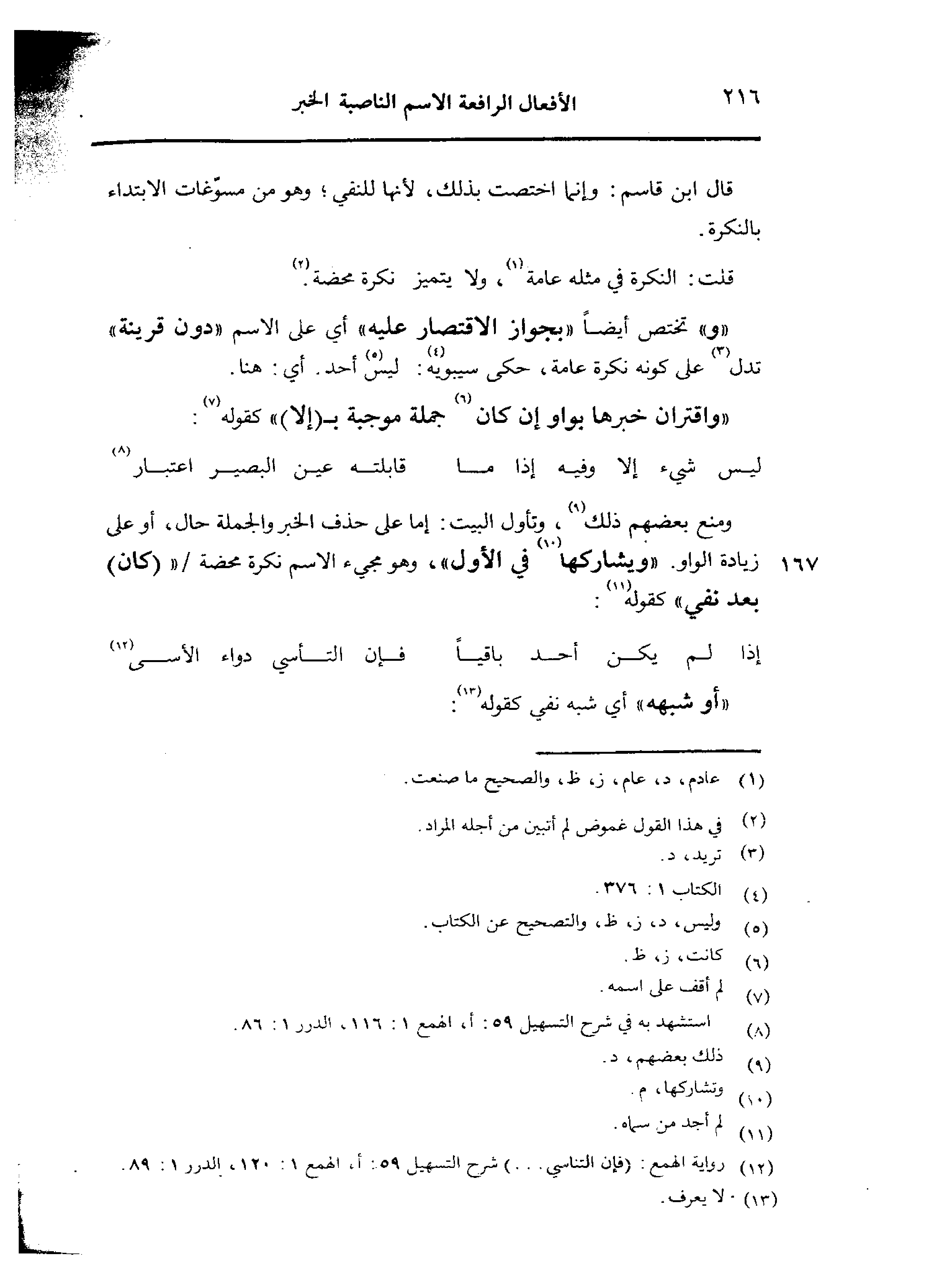 ومنع بعضهم ذلك، تأول البيت: إما على حذف الخبر والجملة حال، أو على زيادة الواو. «ويشاركها فى الأول»، وهو مجئ الاسم نكرة محضة/ «(كان) بعد نفي» كقوله:
