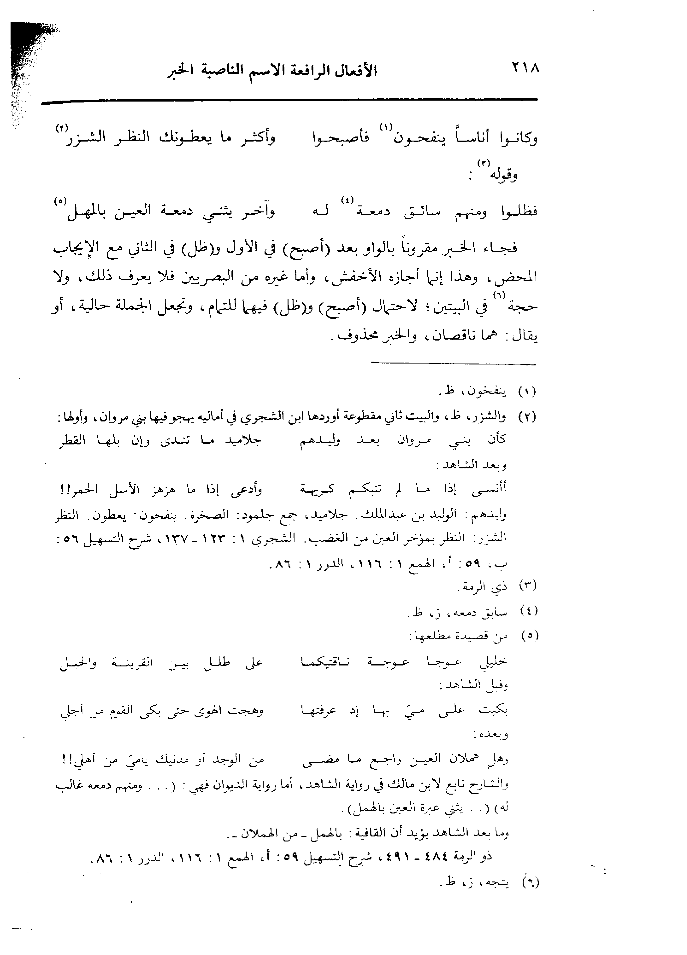 فجاء الخبر مقرونًا بالواو بعد (أصبح) في الأول و (ظل) في الثاني مع الإيجاب المحض، وهذا إنما أجازه الأخفش، وأما غيره من البصريين فلا يعرف ذلك، ولا حجة في البيتين؛ لاحتمال (أصبح) و (ظل) فيهما للتمام، وتجعل الجملة حالية، أو يقال: هما ناقصان، والخبر محذوف.