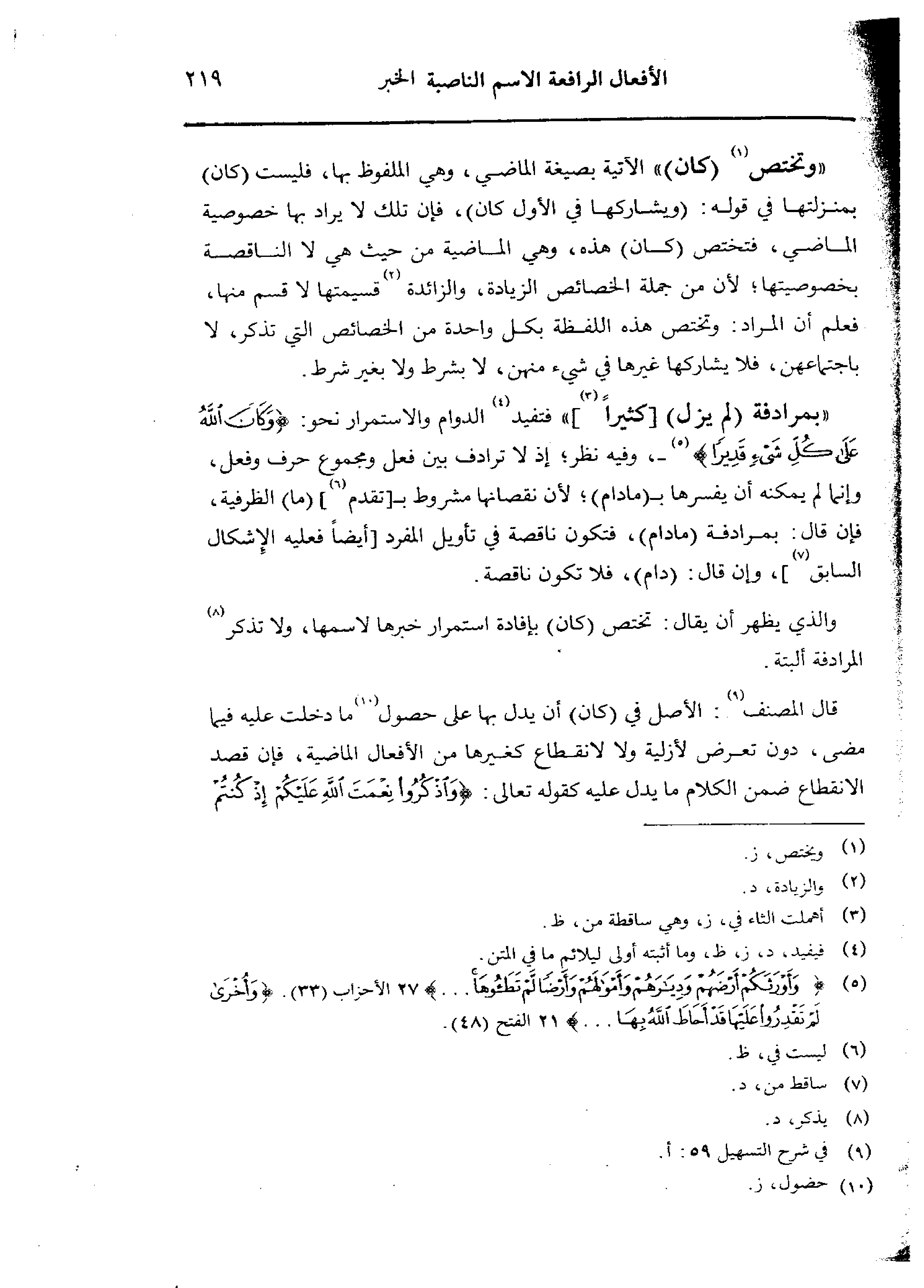 «بمرادفة (لم يزل) [كثيرًا]» فتفيد الدوام والاستمرار نحو: {وكان الله على كل شئ قديرًا} -، وفيه نظر؛ إذ لا ترادف بين فعل ومجموع حرف وفعل، وإنما لم يمكنه أن يفسرها بـ (مادام)؛ لأن نقصانها مشروط بـ[تقدم] (ما) الظرفية، فإن قال: بمرادفة (مادام 9، فتكون ناقصة في تأويل المفرد [أيضًا فعليه الإِشكال السابق]، وإن قال: (دام)، فلا تكون ناقصة.