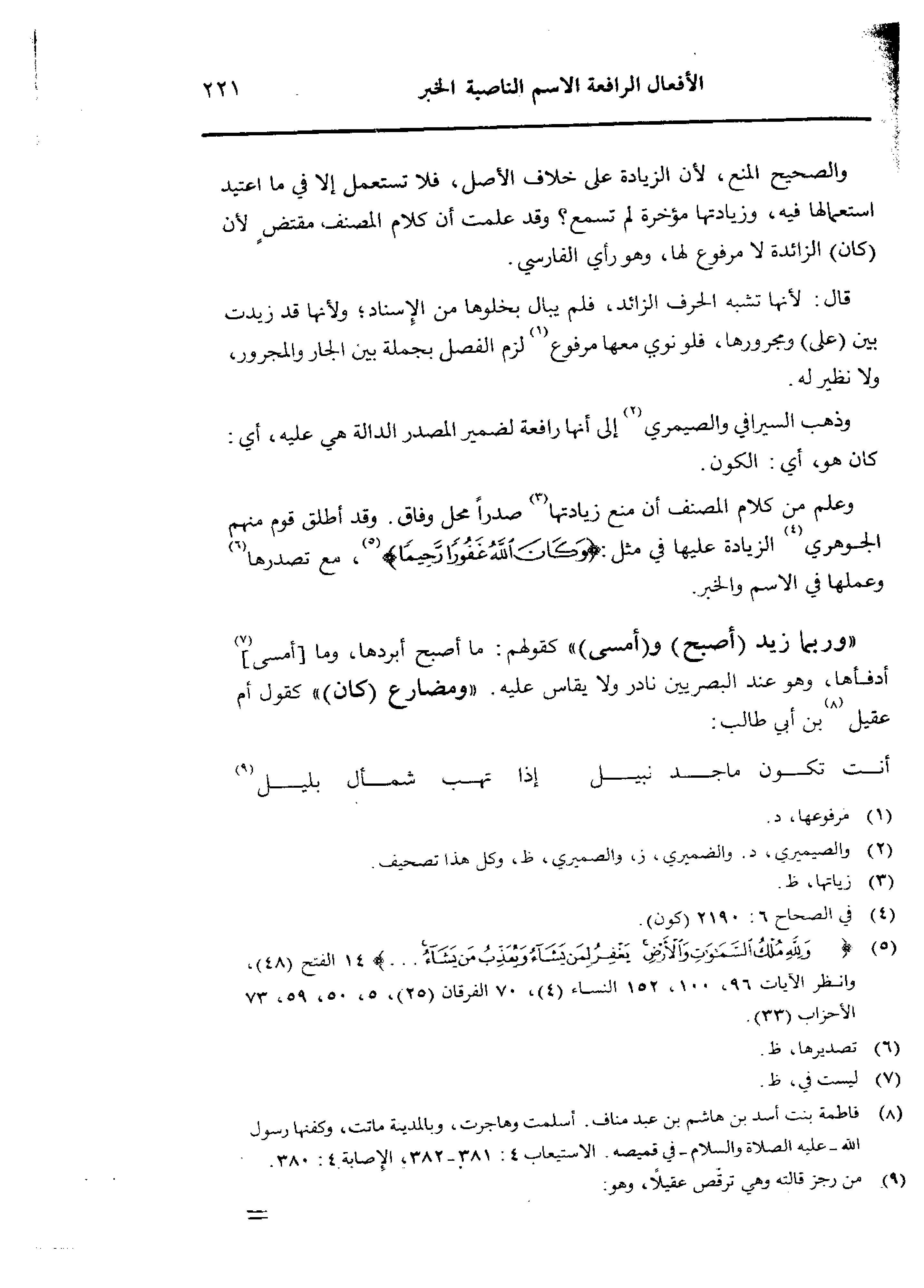 «وربما زيد (أصبح) و (أمسى)» كقولهم: ما أصبح أبردها، وما [أمسى] أدفأها، وهو عند البصريين نادر ولا يقاس عليه. «ومضارع (كان)» كقول أم عقيل بن أبي طالب:
