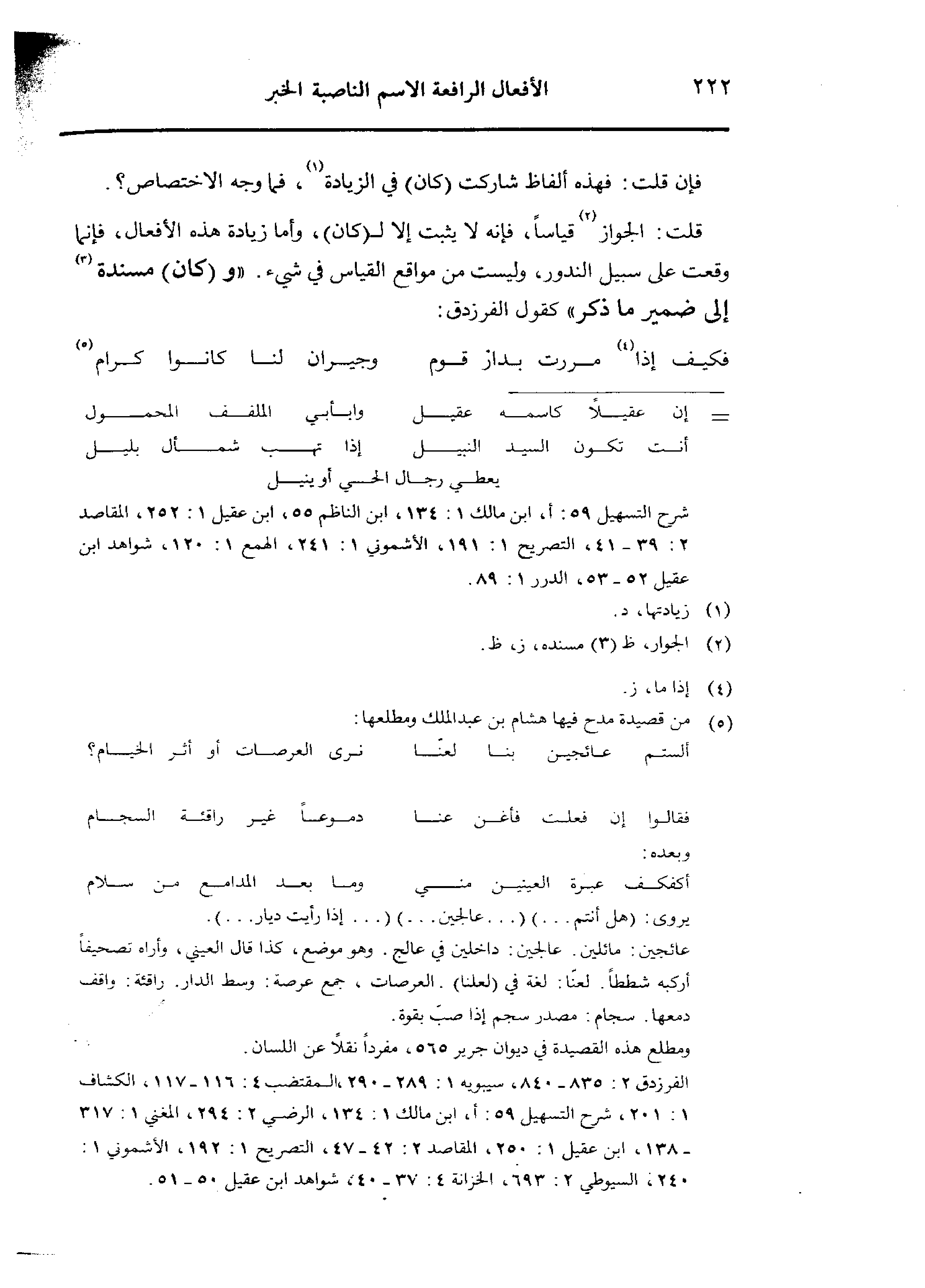 قلت: الجواز قياسًا، فإنه لا يثبت إلا لـ (كان)، وأما زيادة هذه الأفعال، فإنما وقعت على سبيل الندور، وليست من مواقع القياس في شيء. «و (كان) مسندة إلى ضمير ما ذكر» كقول الفرزوق: