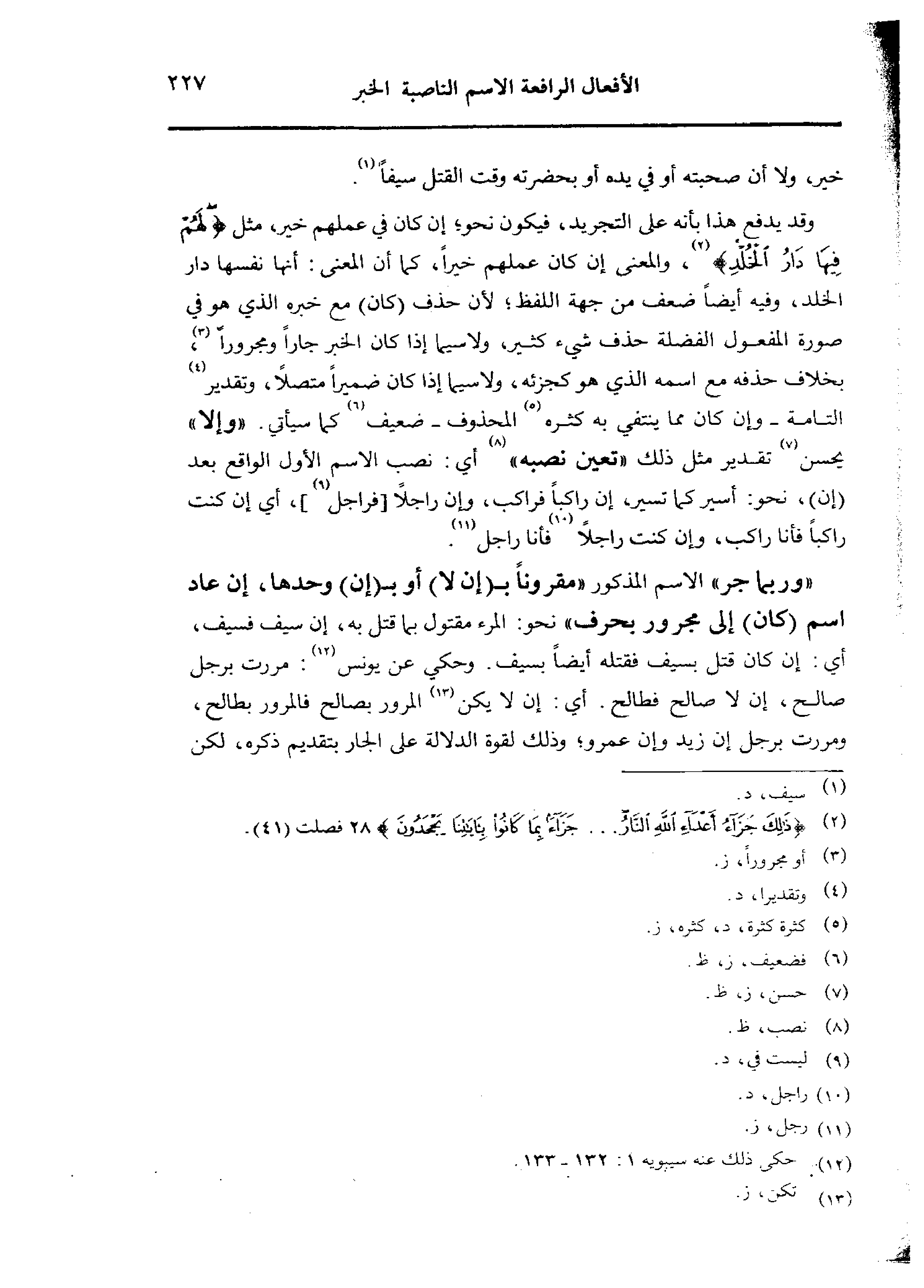 خير، ولا أن صحبته أو في يده او بحضرته وقت القتل سيفًا. وقد يدفع هذا بأنه على التجريد، فيكون نحو؛ إن كان في عملهم خير، مثل {لهم فيها دار الخلد}، والمعنى إن كان عملهم خيرًا، كما أن المعنى: أنها نفسها دار الخلد، وفيه أيضًا ضعف من جهة اللفظ؛ لأن حذف (كان) مع خبره الذي هو في صورة المفعول الفضلة حذف شيء كثير، ولا سيما إذا كان الخبر جارًا ومجرورًا، بخلاف حذفه مع اسمه الذي هو كجزئه، ولا سيما إذا كان ضميرًا متصلًا، وتقديرالتامة - وإن كان مما ينتفي به كثره المحذوف - ضعيف كما سيأتى. «وإلا» يحسن تقدير مثل ذلك «تعين نصبه» أي: نصب الاسم الأول الواقع بعد (إن)، نحو: أسير كما تسير، إن راكبًا فراكب، وإن راجلاص [فراجل]، أي إن كنت راكبًا فأنا راكب، وإن كنت راجلًا فأنا راجل.