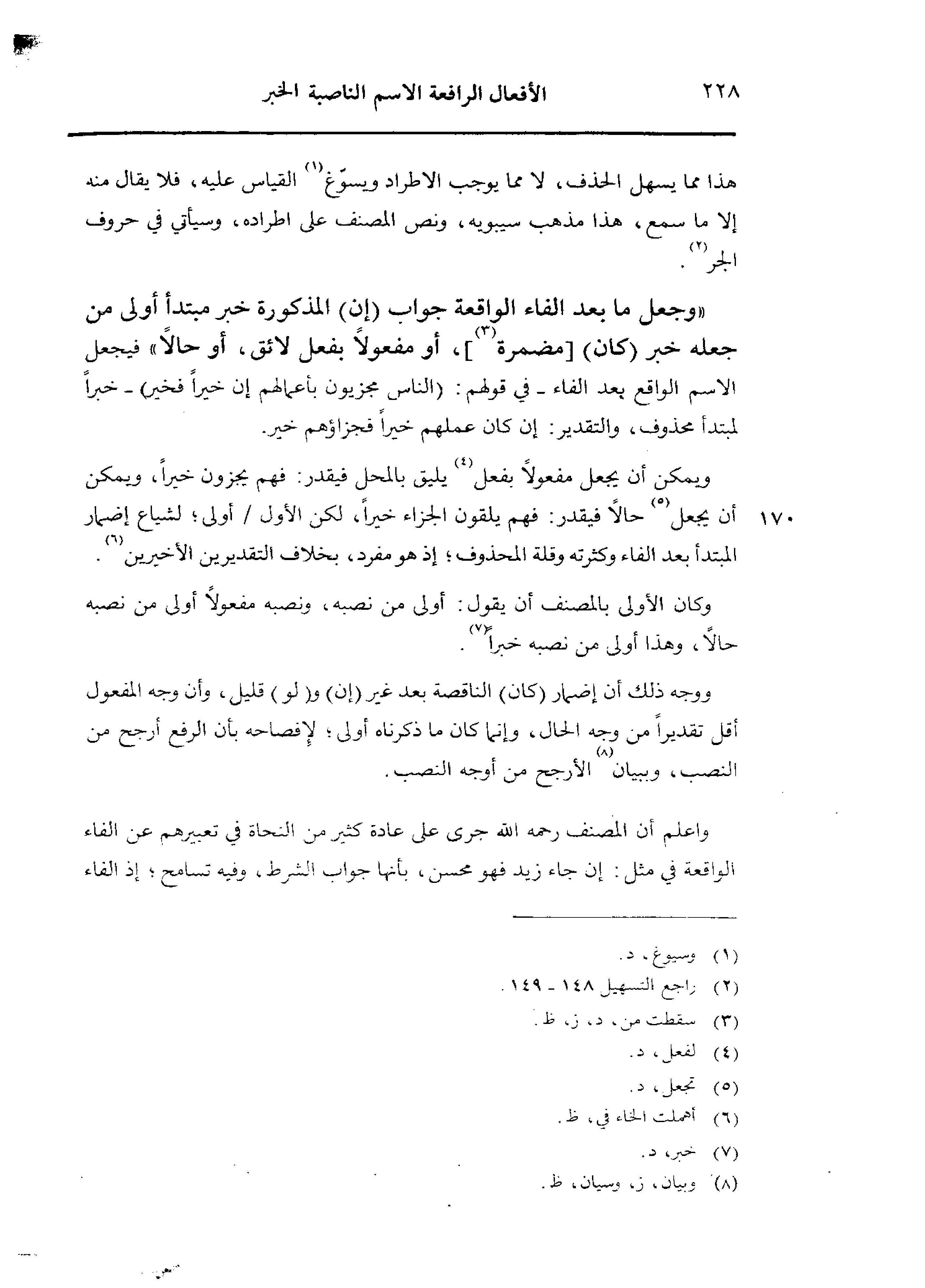 «وجعل ما بعد الفاء الواقعة جواب (إن) المذكورة خبر مبتدأ اولى من جعله خبر 0 كان) [مضمرة]، أو مفعولًا بفعل لائق، أو حالًا» فيجعل الاسم الواقع بعد الفاء - في قولهم: (الناس مجزيون بأعمالهم إن خيرًا فخير) - خبرًا لمبتدأ محذوف، والتقدير: إن كان عملهم خيرًا فجزاؤهم خير.