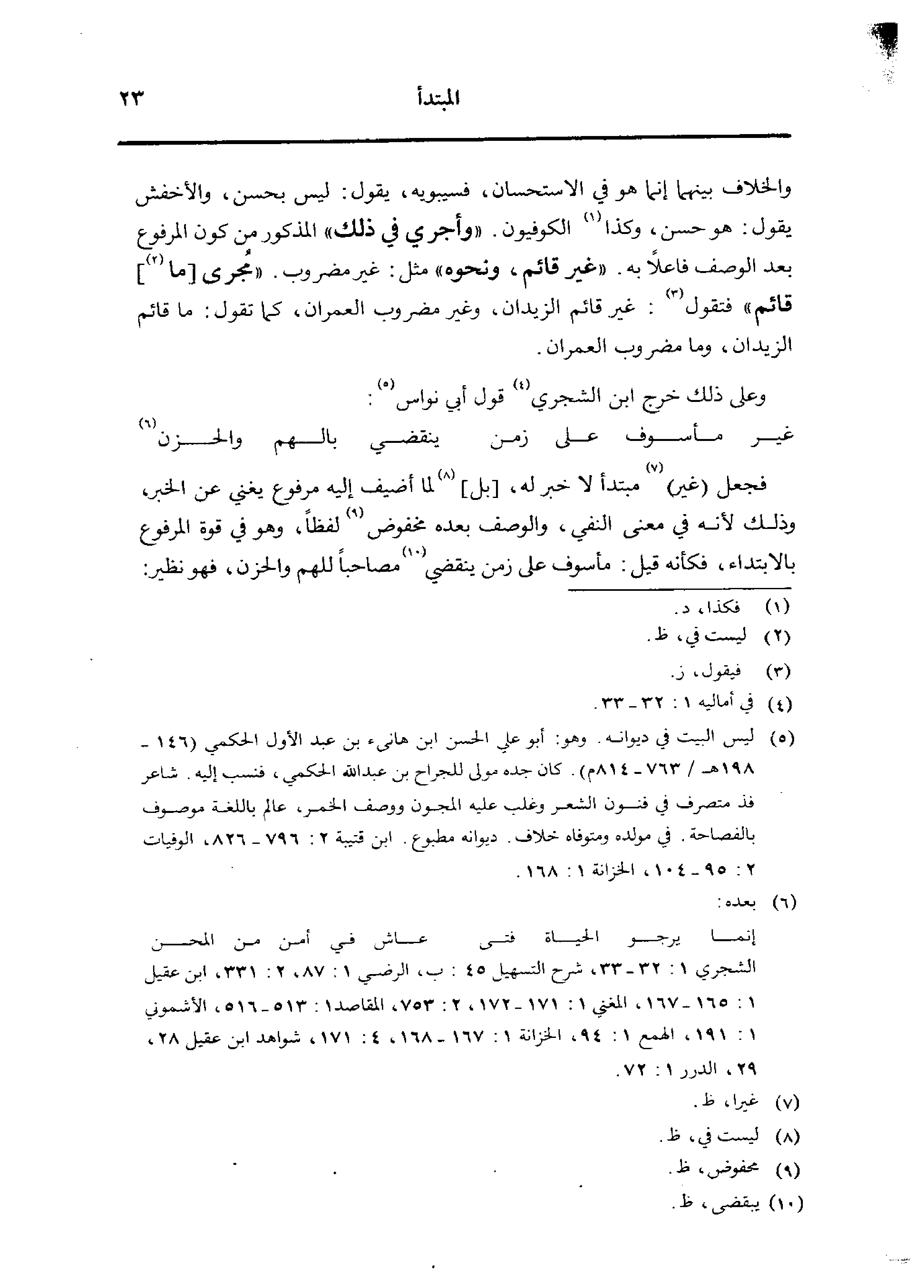 والخلاف ينهما إنما هو الاستحسان، فسيبويه، يقول: ليس بحسن، والأخفش يقول: هو حسن، وكذا الكوفية. «وأجري في ذلك» المذكور من كون المرفوع بعد الوصف فالعلًا به. «غير قائم، ونحوه» مثل: غير مضروب. «مجرى [ما] قائم» فتقول: غير قائم الزيدان، وغير مضروب العمران، كما تقول: ما قائم الزيدان، وما مضروب العمران.