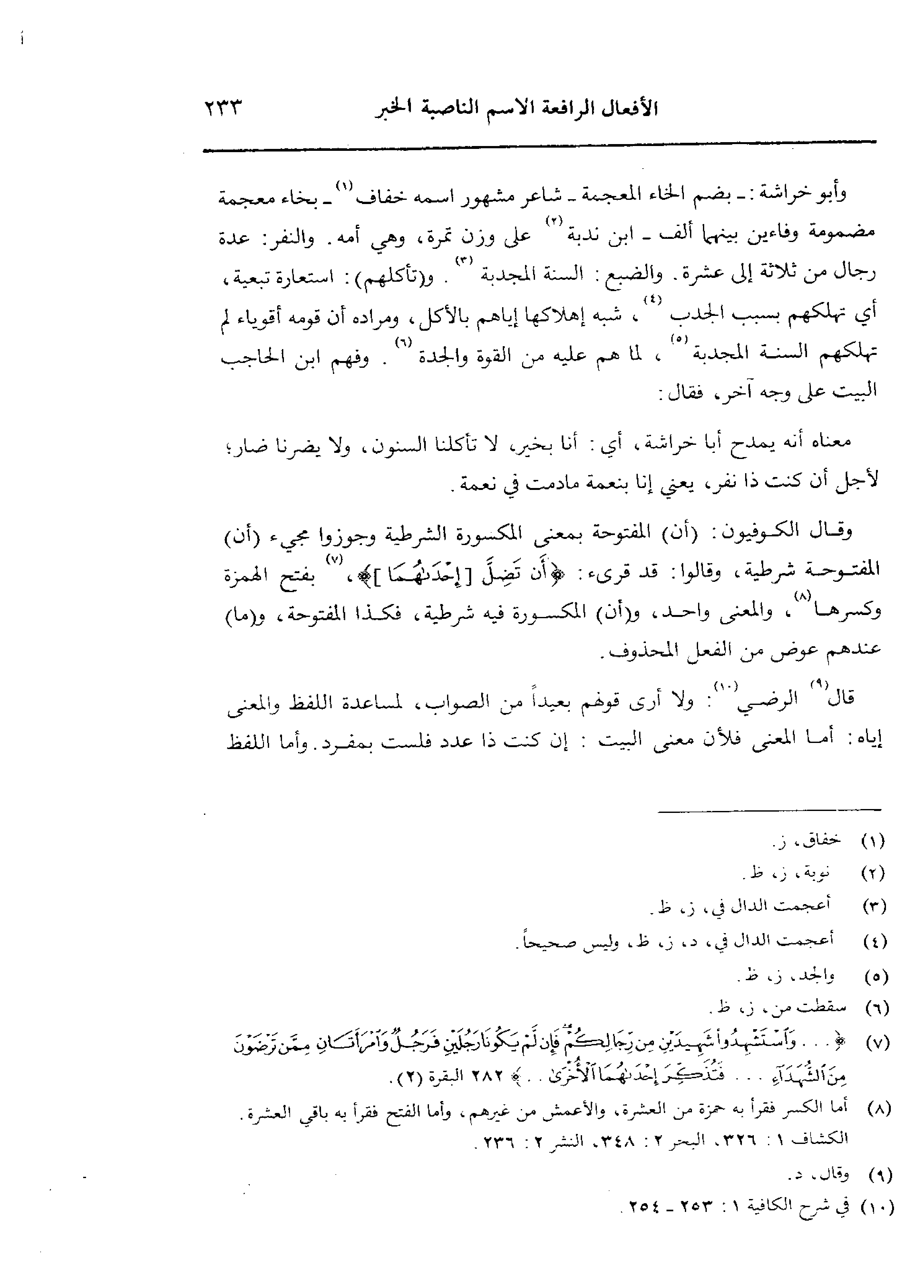 وأبو خراشة: - بضم الخاء المعجمة - شاعر مشهور اسمه خفاف – بخاء معجمة مضمومة وفاءين بينهما ألف - ابن ندبه على وزن تمرة، وهى أمه. والنفر: عدة رجال من ثلاثة إلى عشرة. والضبع: السنة المجدبة. و (تأكلهم): استعارة تبعية، أي تهلكهم بسبب الجدب، شبه إهلاكها إياها بالأكل، ومراده أن قومه أقوياء لم تهلكهم السنة المجدبة، لما هم عليه من القوة والجدة. وفهم ابن الحاجب البيت على وجه آخر، فقال: