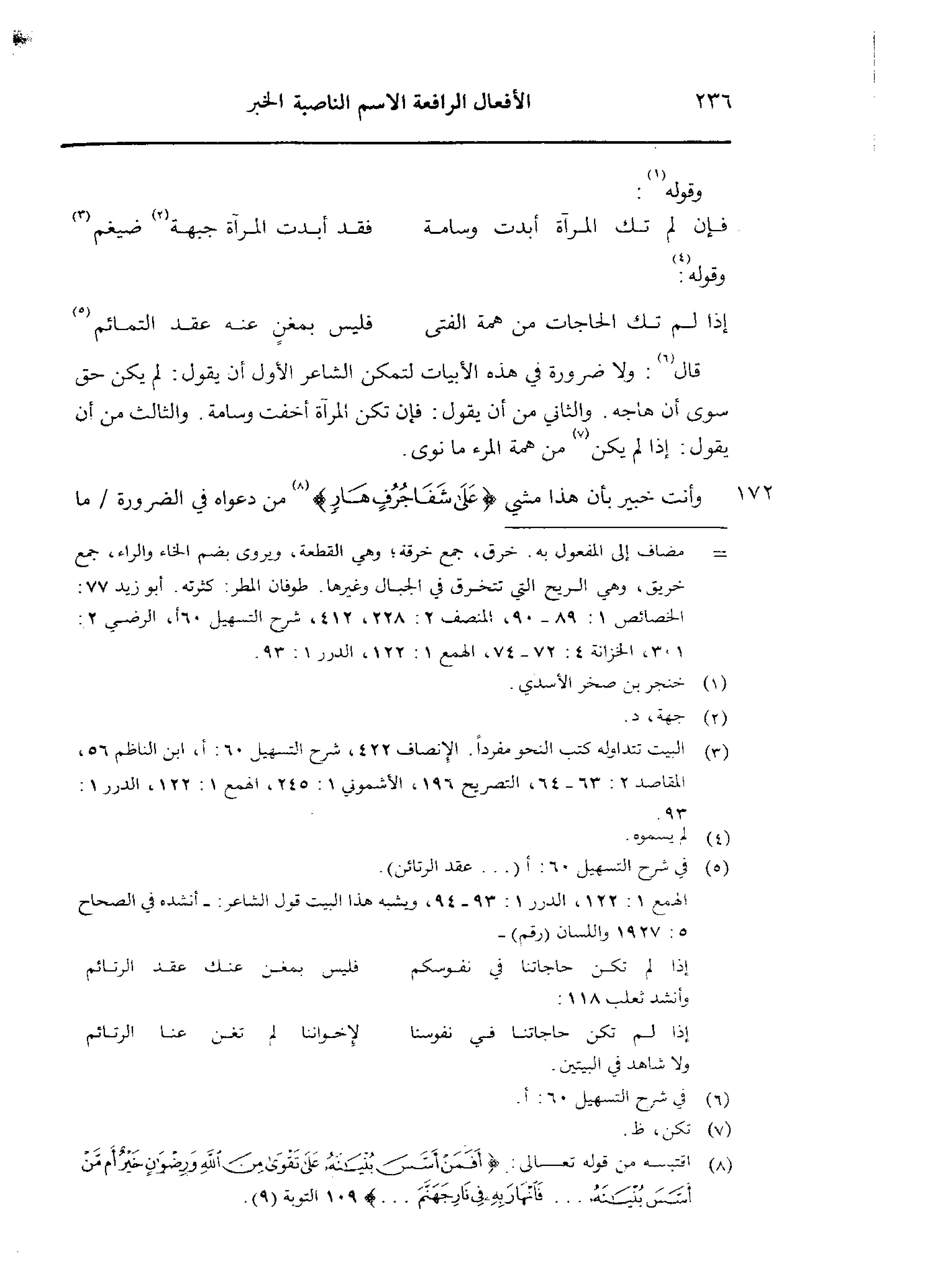قال: ولا ضرورة في هذه الأبيات لتمكن الشاعر الأول أن يقول: لم يكن حق سوى أن هاجه. والثاني من أن يقول: فإن تكن المرآة أخفت وسامة. والثالث من أن يقول: إذا لم يكن من همة المرء ما نوى.