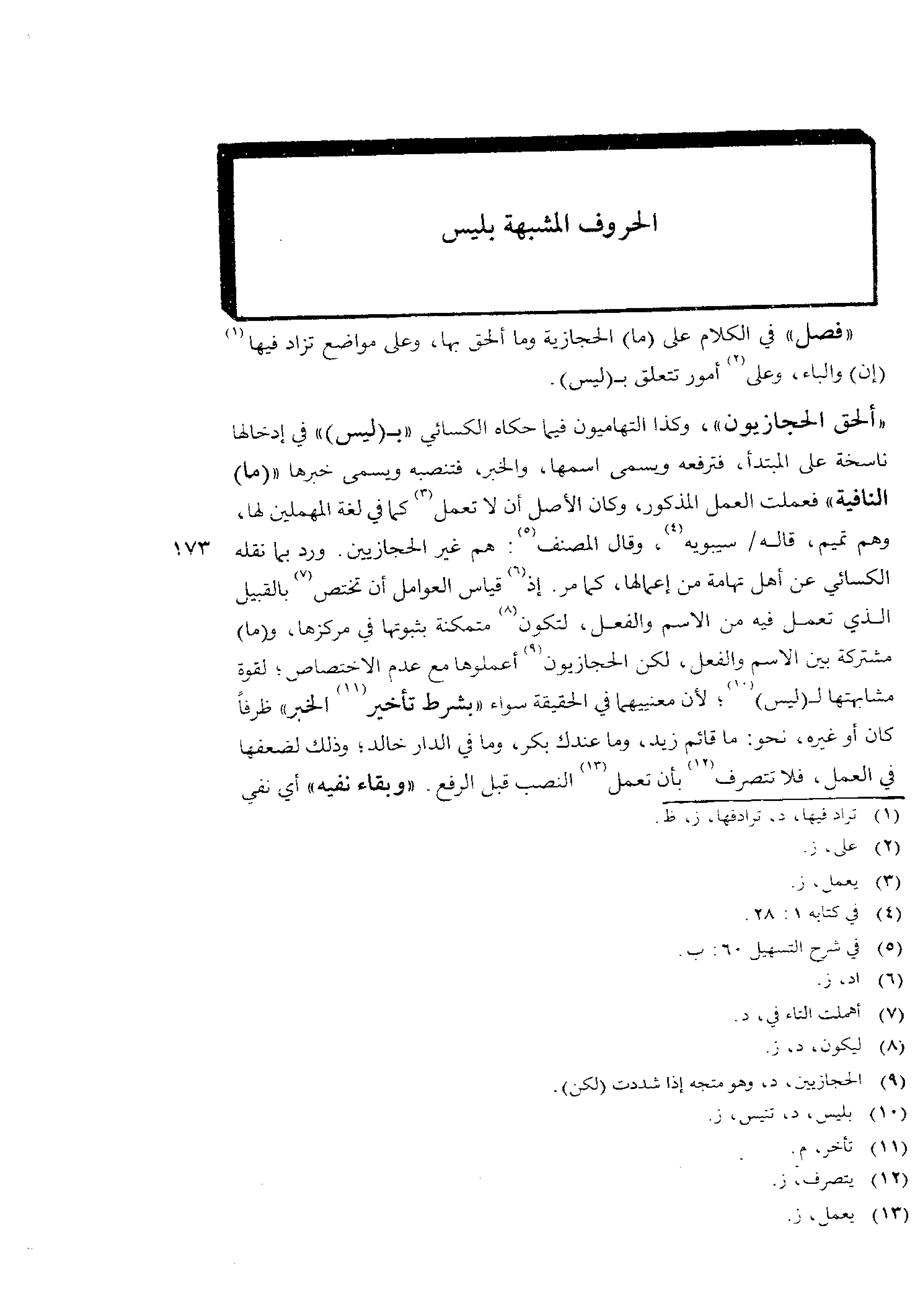 «فصل» في الكلام على (ما) الحجازية وما ألحق بها، وعلى مواضع تزايد فيها (إن) والباء، وعلى أمور تتعلق بـ (ليس).