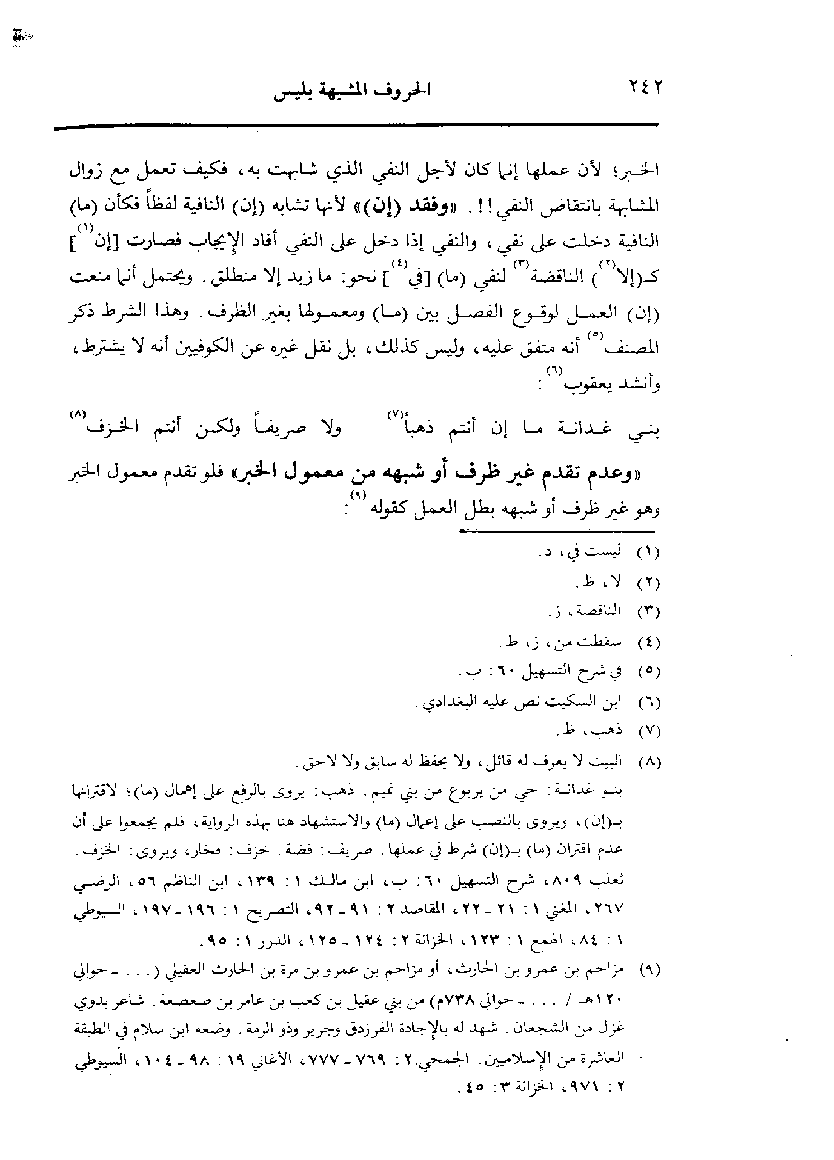 الخبر؛ لأن عملها إنما كان لأجل النفي الذي شابهت به، فكيف تعمل مع زوال المشابهة بانتقاض النفي! ! . «وفقد (إن)» لأنها تشابه (إن) النافية لفظًا فكأن (ما) النافية دخلت على نفي، والنفي أفاد الإيجاب فصارت [إن] كـ (إلا) الناقضة لنفى (ما) [في] نحو: ما زيد إلا منطلق. ويحتمل أنما منعت (إن) العمل لوقوع الفصل بين (ما) ومعمولها بغير الظرف. وهذا الشرط ذكر المصنف أنه متفق عليه، وليس كذلك، بل نقل غيره عن الكوفيين أنه لا يشترطظنوأنشد يعقوب: