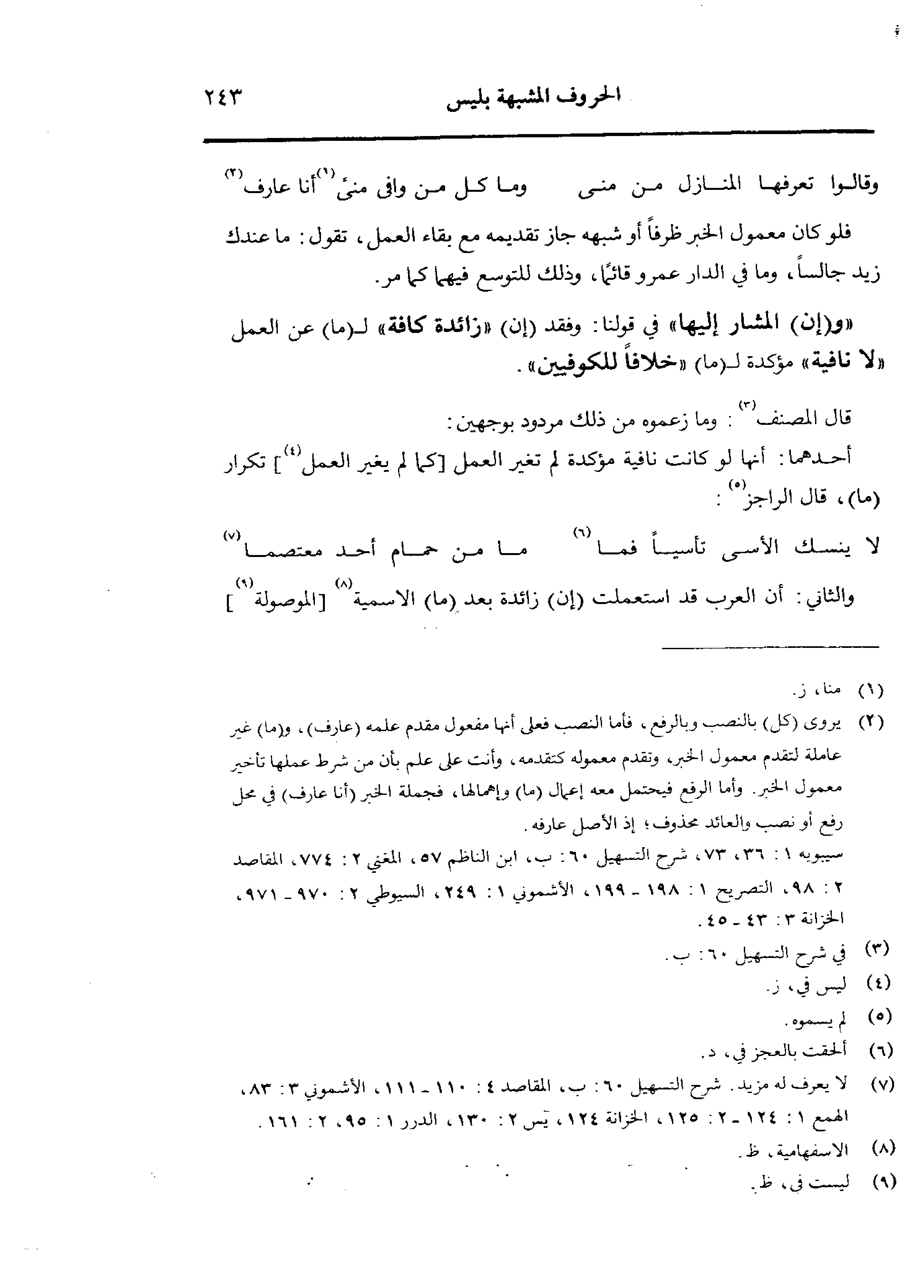 «و (إن المشار إليها» في قولنا: وفقد (إن) «زائدة كافة» لـ (ما) عن العمل «لا نافية» مؤكدة لـ (ما) «خلافًا للكوفيين».