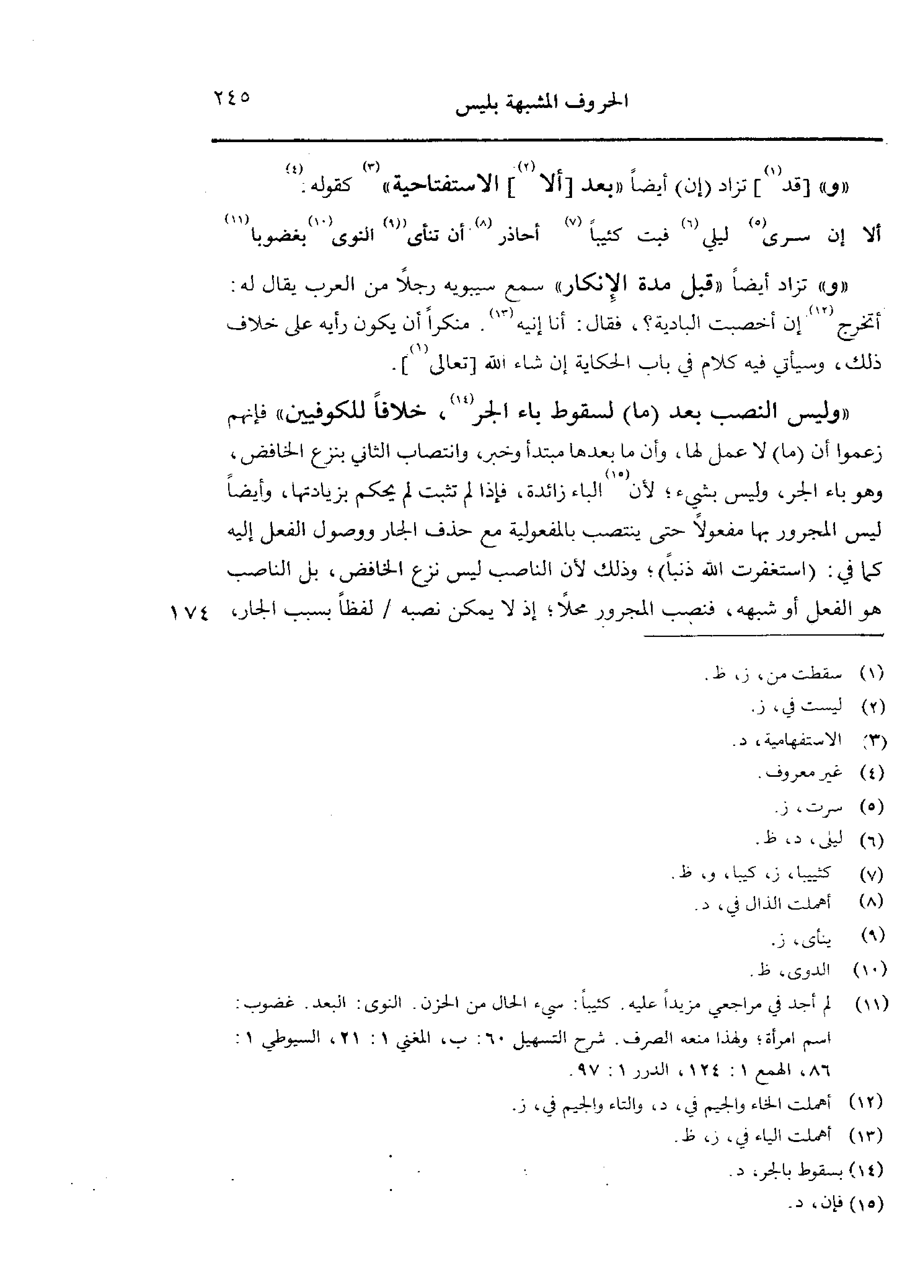 «وليس النصب بعد (ما) لسقوط باء الجر، خلافًا للكوفيين» فإنهم زعموا أن (ما) لا عمل لها، وأن ما بعدها مبتدأ وخبر، وانتصاب الثاني بنزع الخافض، وهو باء الجر، وليس بشيء؛ لأن الباء زائدة، فإذا لم تثبت لم يحكم بزيادتها، وأيضًا ليس المجرور بها مفعولًا حتى ينتصب بالمفعولية مع حذف الجار ووصول الفعل إليه كما في: (استغفرت الله ذنبًا)؛ وذلك لأن الناصب ليس نزع الخافض، بل الناصب هو الفعل أو شبهه، فنصب المجرور محلًا؛ إذ لا يمكن نصبه/ لفظًا بسبب الجار، 174
