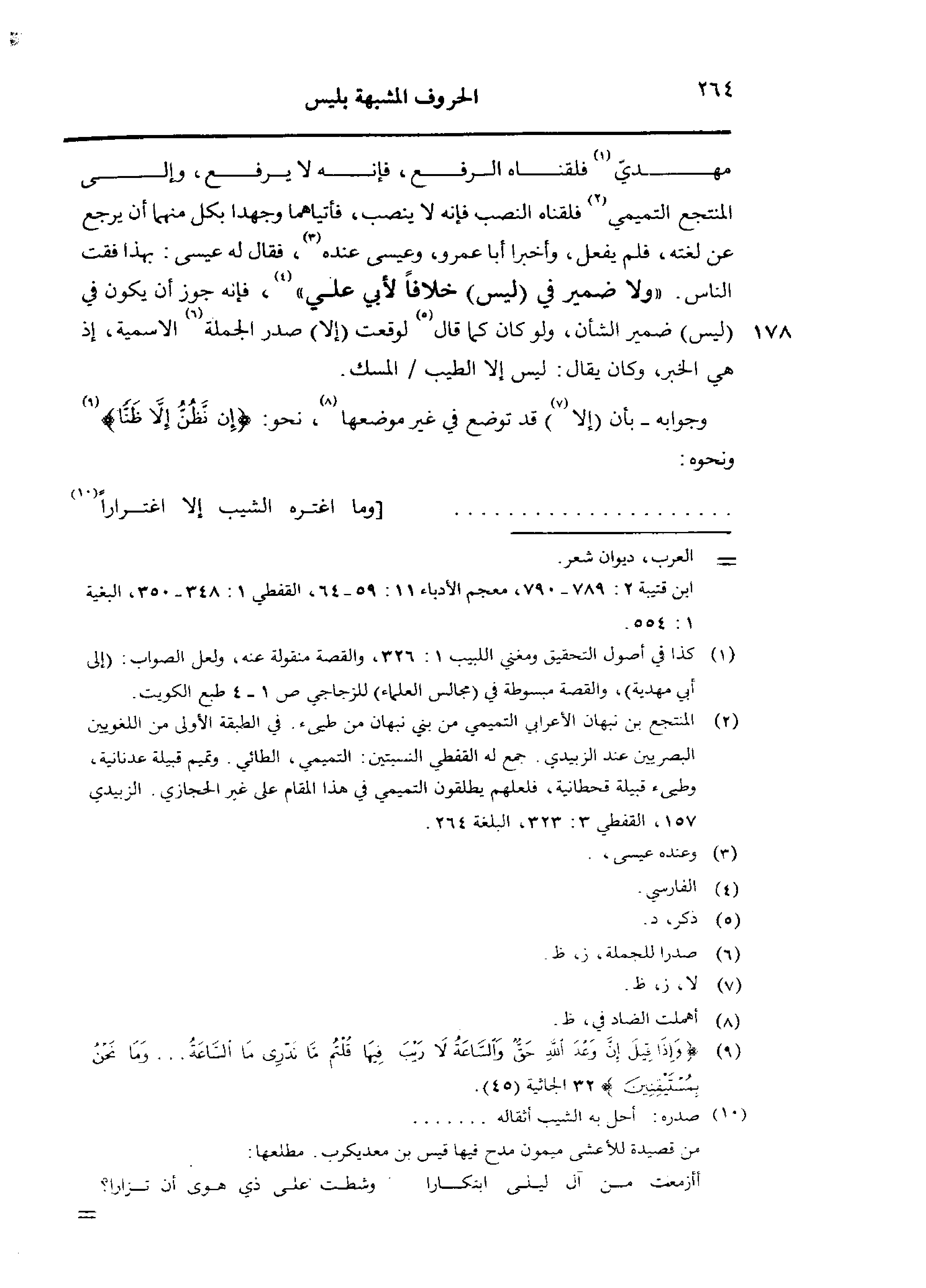 مهديّ فلقناه الرفع، فإنه لا يرفع، وإلى المنتجع التميمي فلقناه النصب فإنه لا ينصب، فأتياهما وجهدا بكل منهما أن يرجع عن لغته، فلم يفعل، وأخبروا أبا عمرو، وعيسى عنده، فقال له عيسى: بهذا فقت الناس. «ولا ضمير في (ليس) خلافًا لأبي علي»، فإنه جوز أن يكون في (ليس) ضمير الشأن، ولو كان كما قال لوقعت (إلا) صدر الجملة الاسمية، إذ هى الخبر، وكان يقال: ليس إلا الطيب/ المسك.
