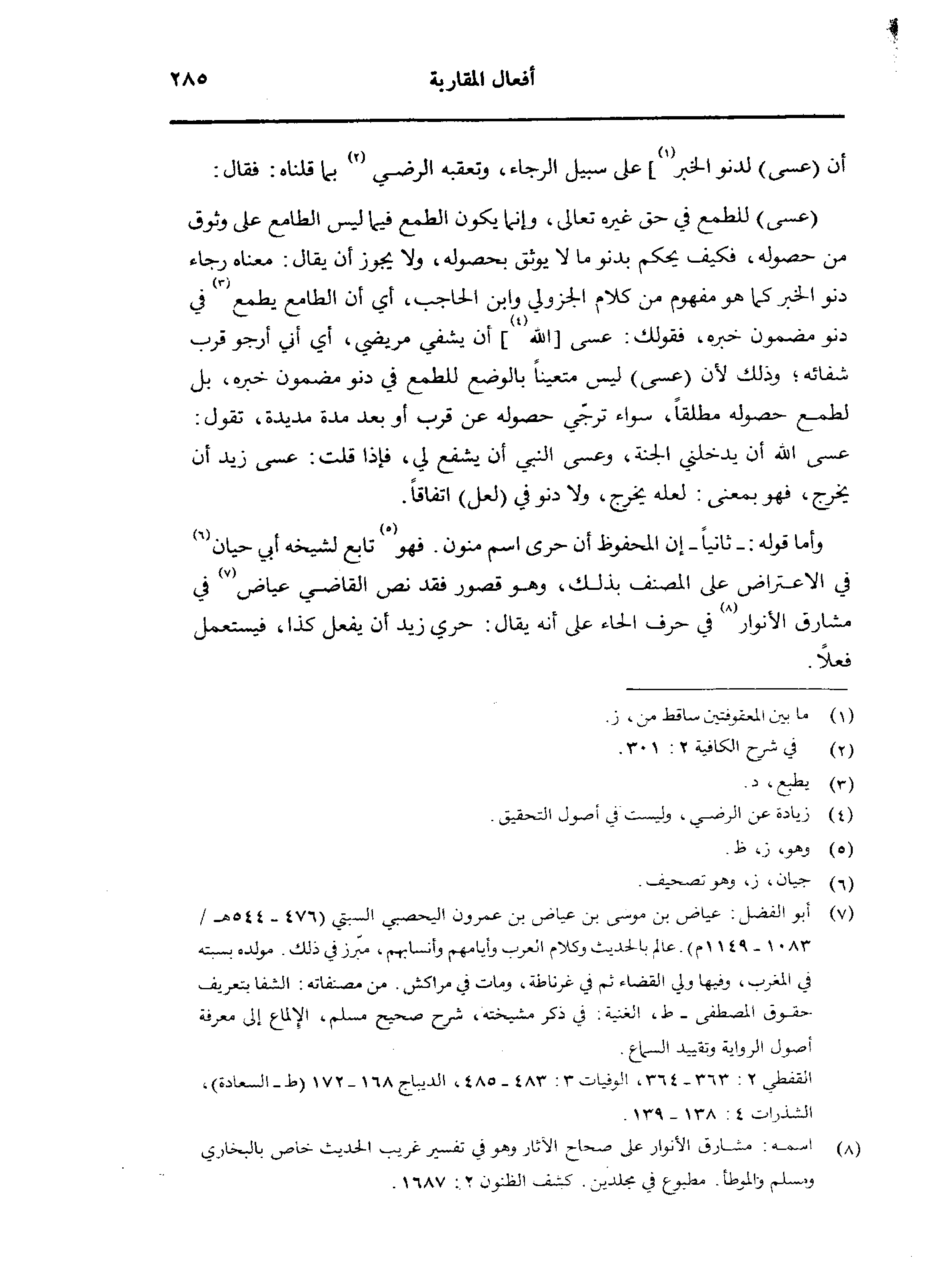 أن (عسى) لدنو الخبر] على سبيل الرجاء، وتعقبه الرضي بما قلناه: فقال: (عسى) للطمع في حق غيره تعالى، وإنما يكون الطمع فيما ليس الطامع على وثوق من حصوله، فكيف يحكم بدنو ما لا يوثق بحصوله، ولا يجوز أن يقال: معناه رجاء دنو الخبر كما هو مفهوم من كلام الجزولي وابن الحاجب، أي أن الطامع يطمع في دنو مضمون خبره، فقولك: عسى [الله] أن يشفي مريضي، أي أني أرجو قرب شفائه؛ وذلك لأن (عسى) ليس متعينًا بالوضع للطمع في دنو مضمون خبره، بل لطمع حصوله مطلقًا، سواء ترجّي حصوله عن قرب أو بعد مدة مديدة، تقول: عسى الله أن يدخلني الجنة، وعسى النبي أن يشفع لي، فإذا قلت: عسى زيد أن يخرج، فهو بمعنى: لعله يخرج، ولا دنو في (لعل) اتفاقًا.