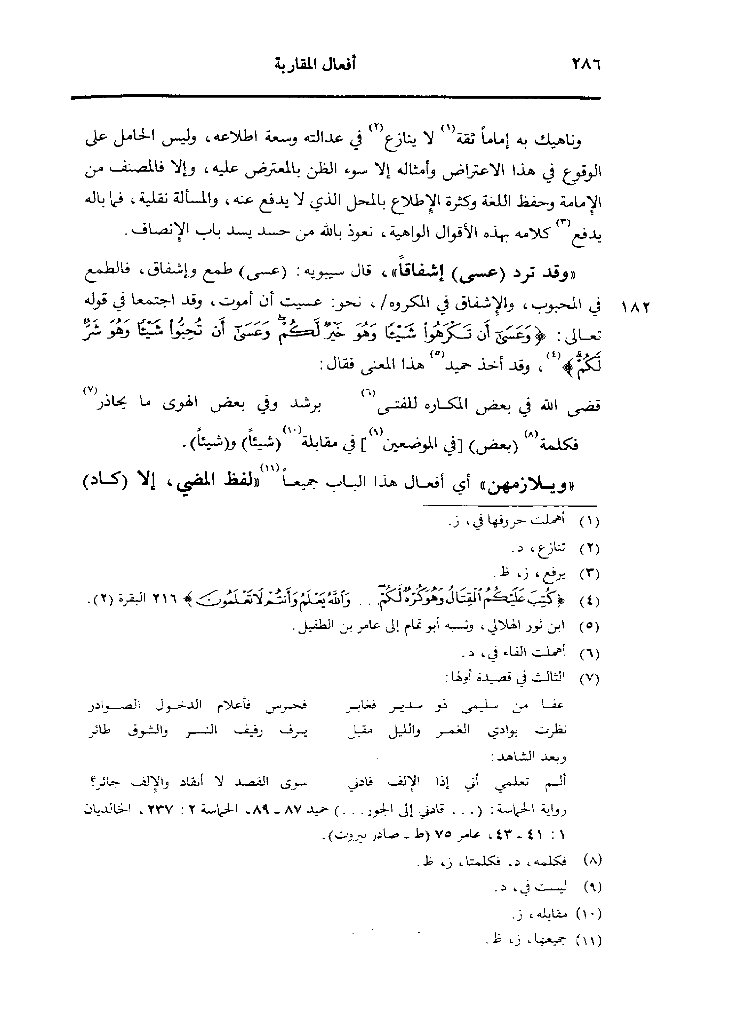 «وقد ترد (عسى) إشفاقًا»، قال سيبويه: (عسى) طمع وإشفاق، فالطمع في المحبوب، والإِفاق في المكروه/، نحو: عسيت أن أموت، وقد اجتمعنا في قوله تعالى: {وعسى أن تكرهوا شيئًا وهو خير لكم وعسى أن تحبوا شيئًا وهو شر لكم}، وقد أخذ حميد هذا المعنى فقال: