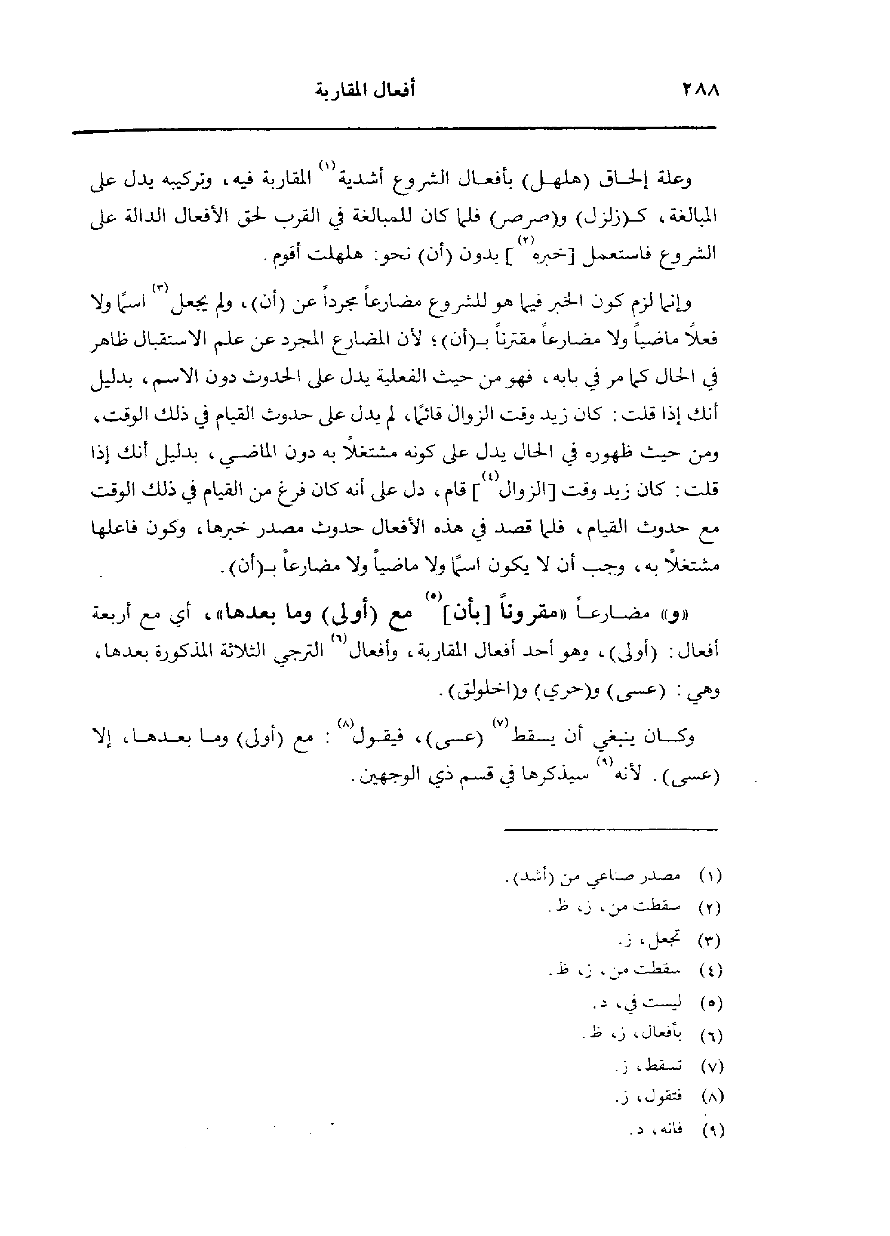 وعلة إلحاق (هلهل) بأفعال الشرع أشدية المقاربة فيه، وتركيبه يدل على المبالغة، كـ (زلزل) و (صرصر) فلما كان للمبالغة في القرب لحق الأفعال الدالة على الشروع فاستعمل [خبره] بدون (أن) نحو: هلهلت أقوم.