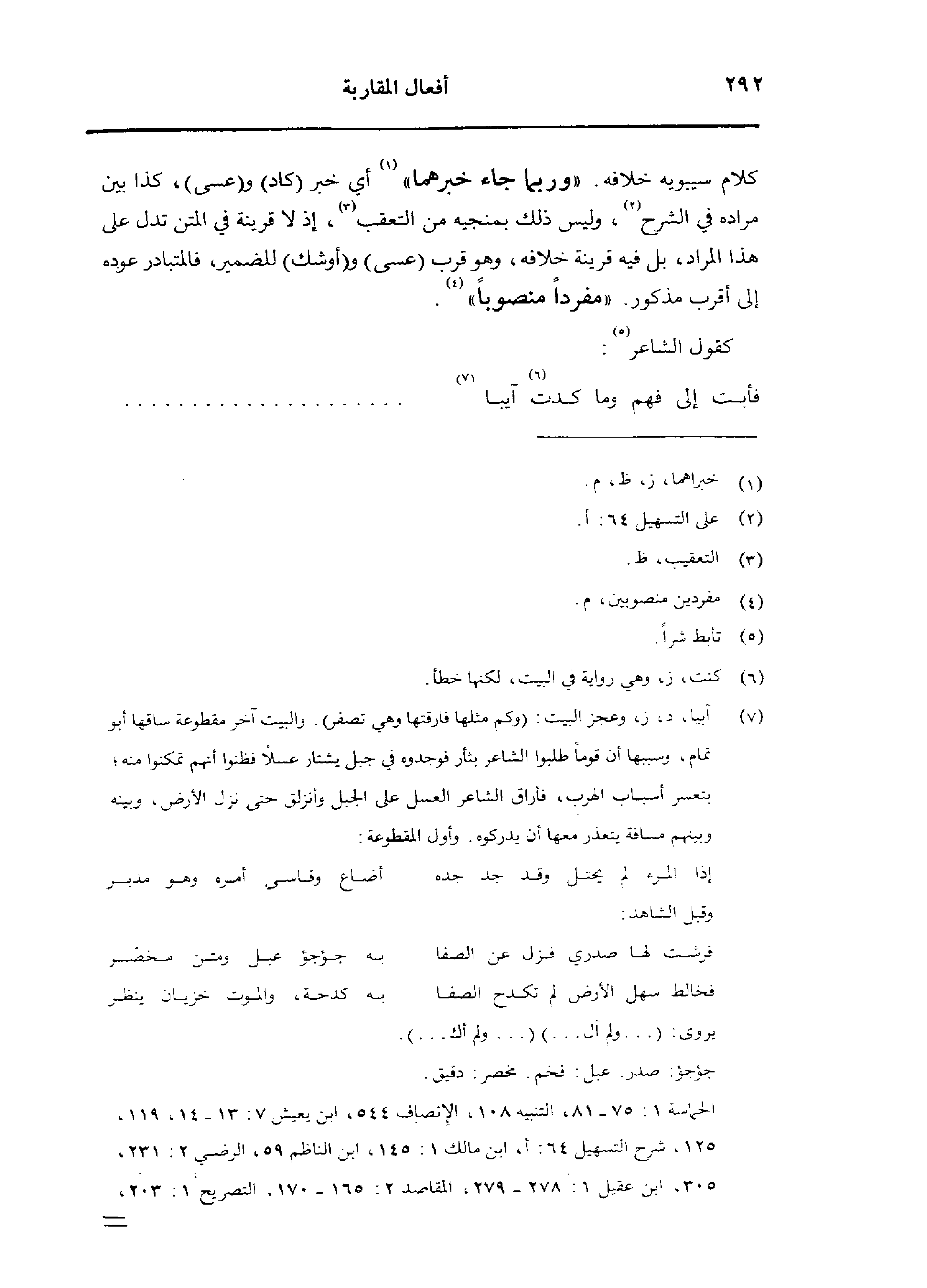 كلام سيبويه خلافه. «وربما جاء خبرهما» أي خبر (كاد) و (عسى)، كذا بين مراده في الشرح، وليس ذلك بمنجيه من التعقب، إذ لا قرينة في المتن تدل على هذا المراد، بل فيه قرينة خلافه، وهو قرب (عسى) و (أوشك) للضمير، فالمتبادر عوده إلى أقرب مذكور. «مفردًا منصوبًا».