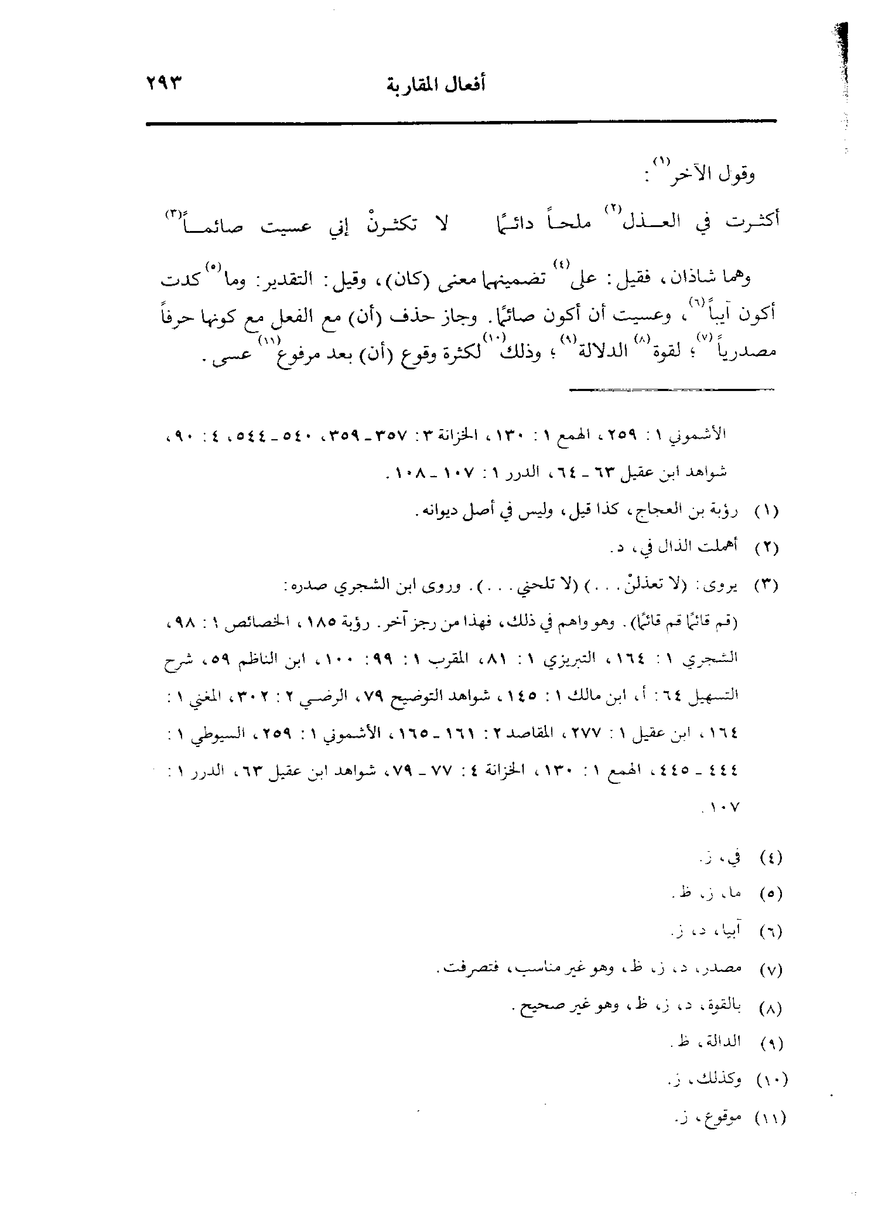 وهما شاذان، فقيل على تضمينهما معنى (كان)، وقيل: التقدير: وما كدت أكون آبيًا، وعسيت أن أكون صائمًا. وجاز حذف (أن) مع الفعل مع كونها حرفًا مصدريًا؛ لقوة الدلالة؛ وذلك لكثرة وقوع (أن) بعد مرفوع عسى.