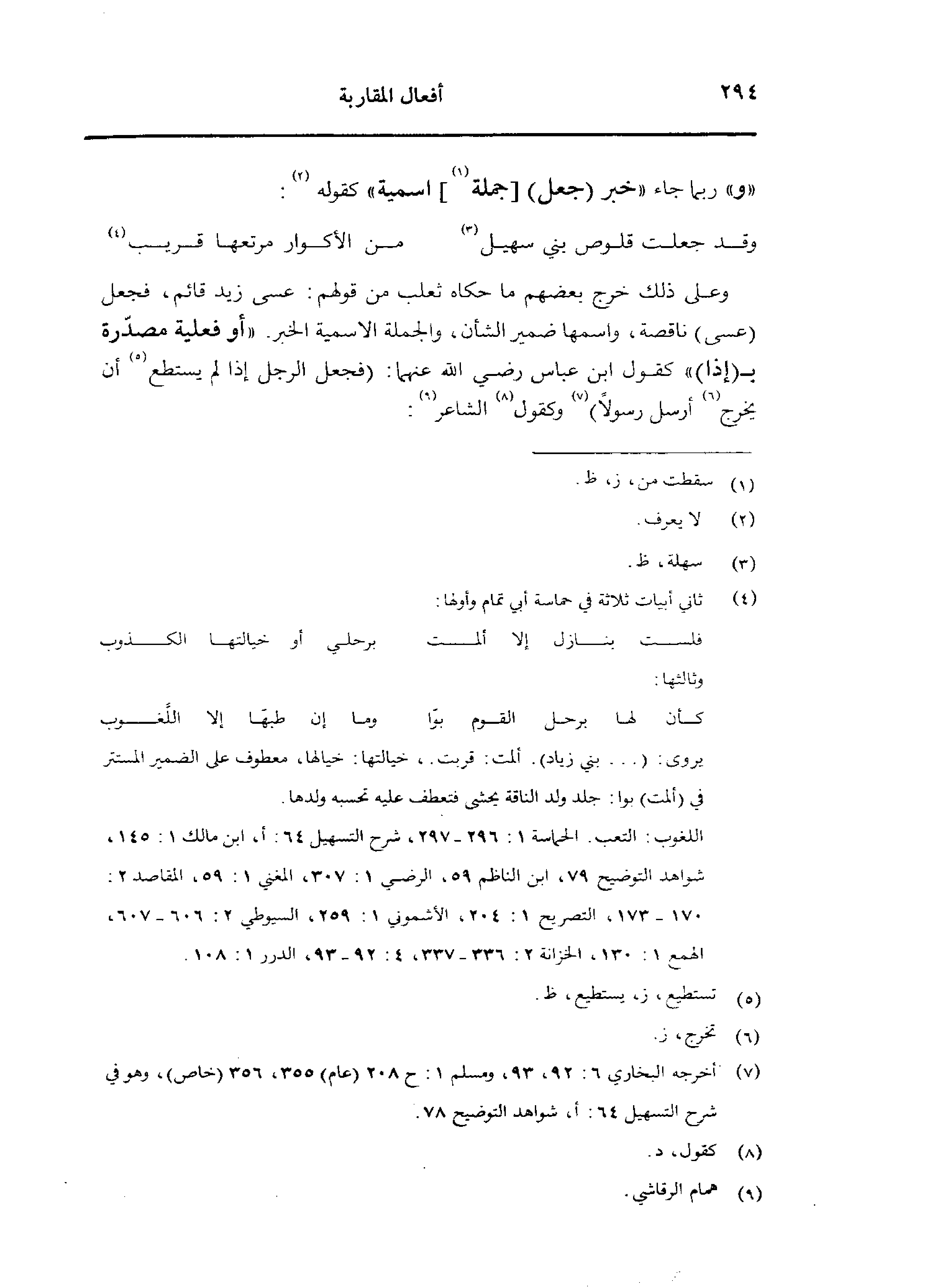 وعلى ذلك خرج بعضهم ما حكاه ثعلب من قولهم: عسى زيد قائم، فجعل (عسى) ناقصة، واسمها ضمير الشأن، والجملة الاسمية الخبر. «أو فعلية مصدّرة بـ (إذا)» كقول ابن عباس رضي الله عنهما: (فجعل الرجل إذا لم يستطع أن يخرج أرسل رسولًا) وكقول الشاعر: