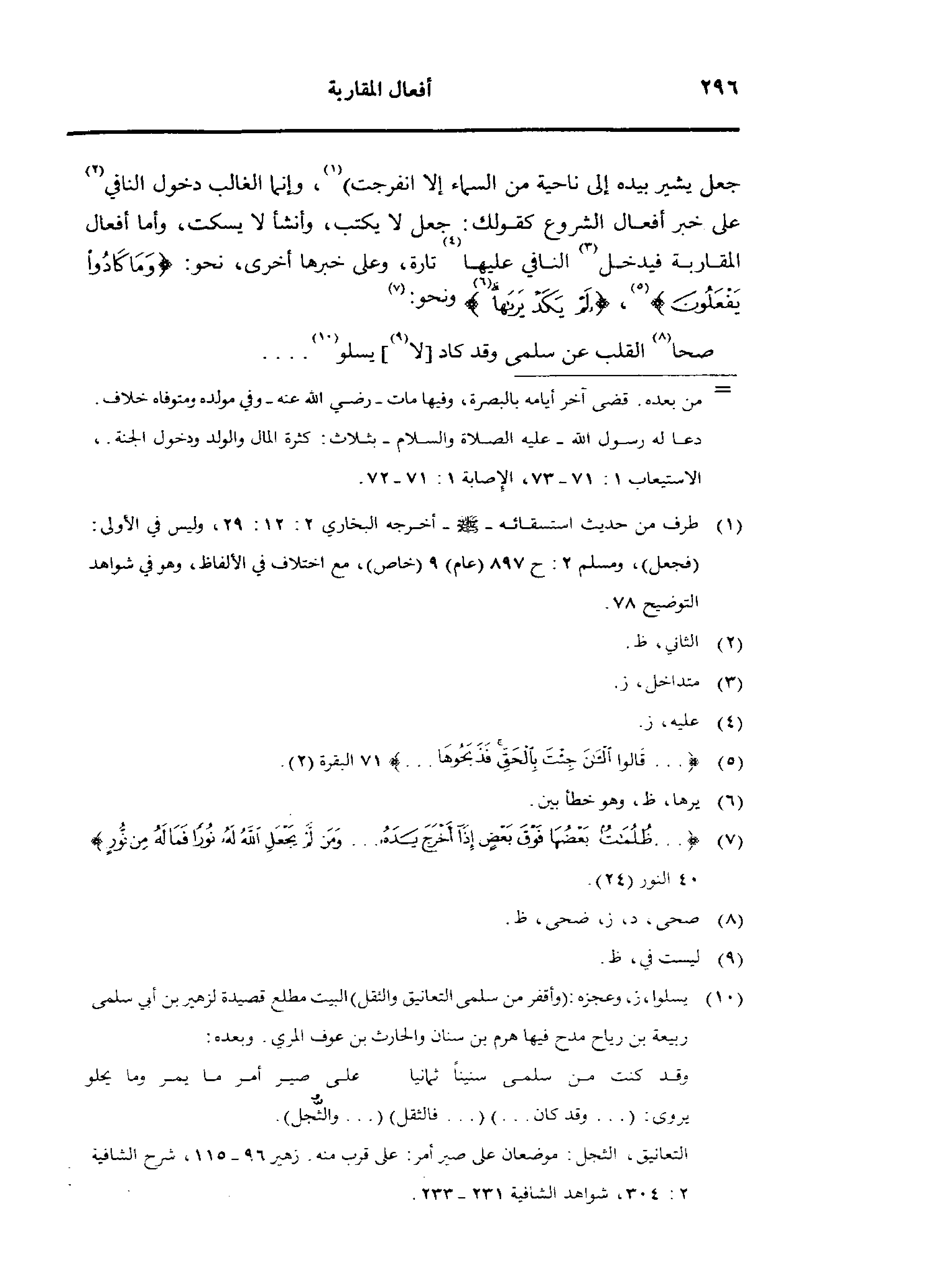جعل يشير بيده إلى ناحية من السماء إلا انفرجت)، وإنما الغالب دخول النافي على خبر أفعال الروع كقولك: جعل لا يكتب، وأنشا لا يسكت، وأما أفعال المقاربة فيدخل النافي عليها تارة، وعلى خبرها أخرى، نحو: {لم يكد يراها} ونحو: