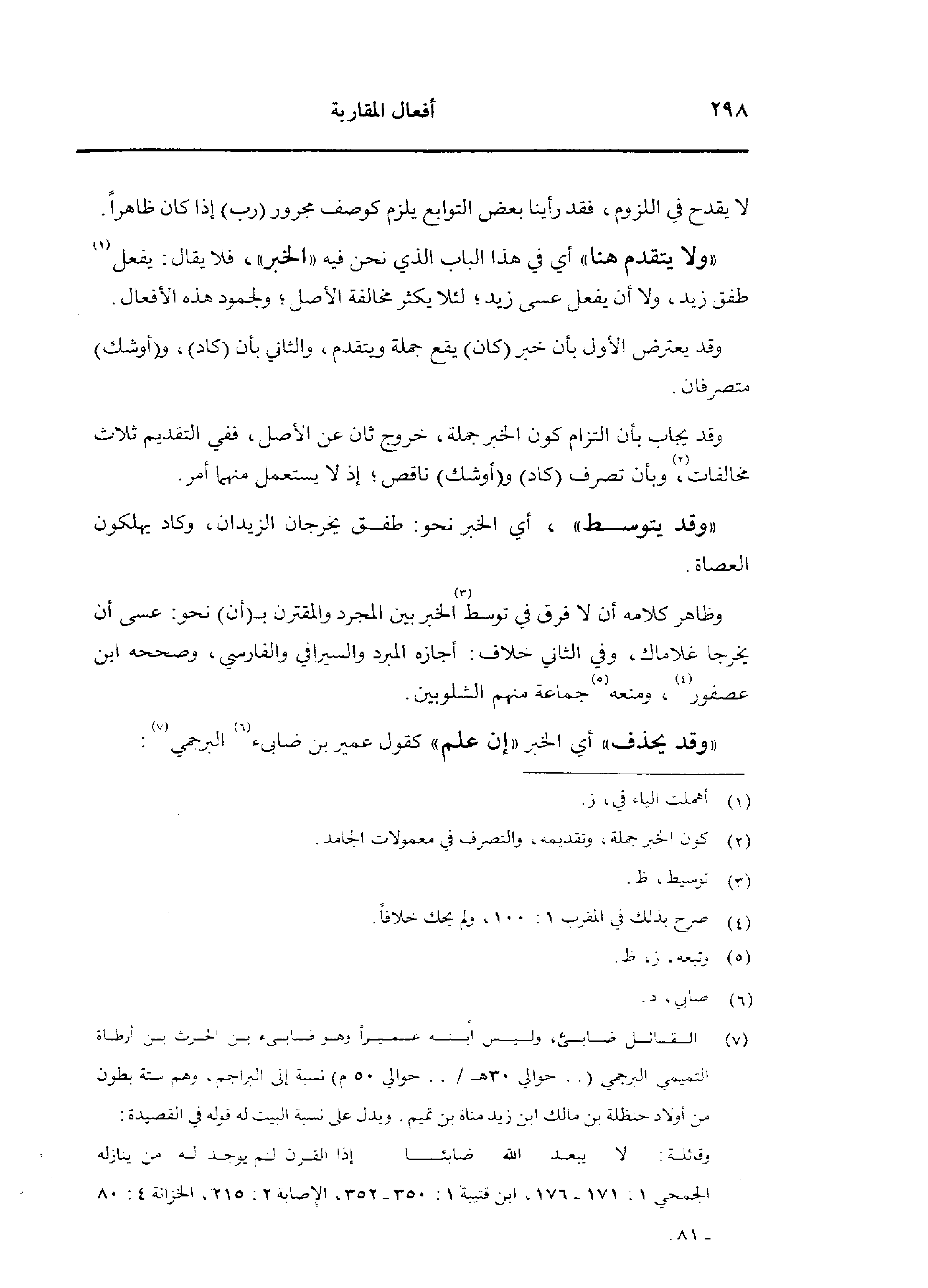 «ولا يتقدم هنا» أي في هذا الباب الذي نحن فيه «الخبر»، فلا يقال: يفعل طفق زيد، ولا أن يفعل عسى زيد؛ لئلا يكثر مخالفة الأصل؛ ولجمود هذه الأفعال.
