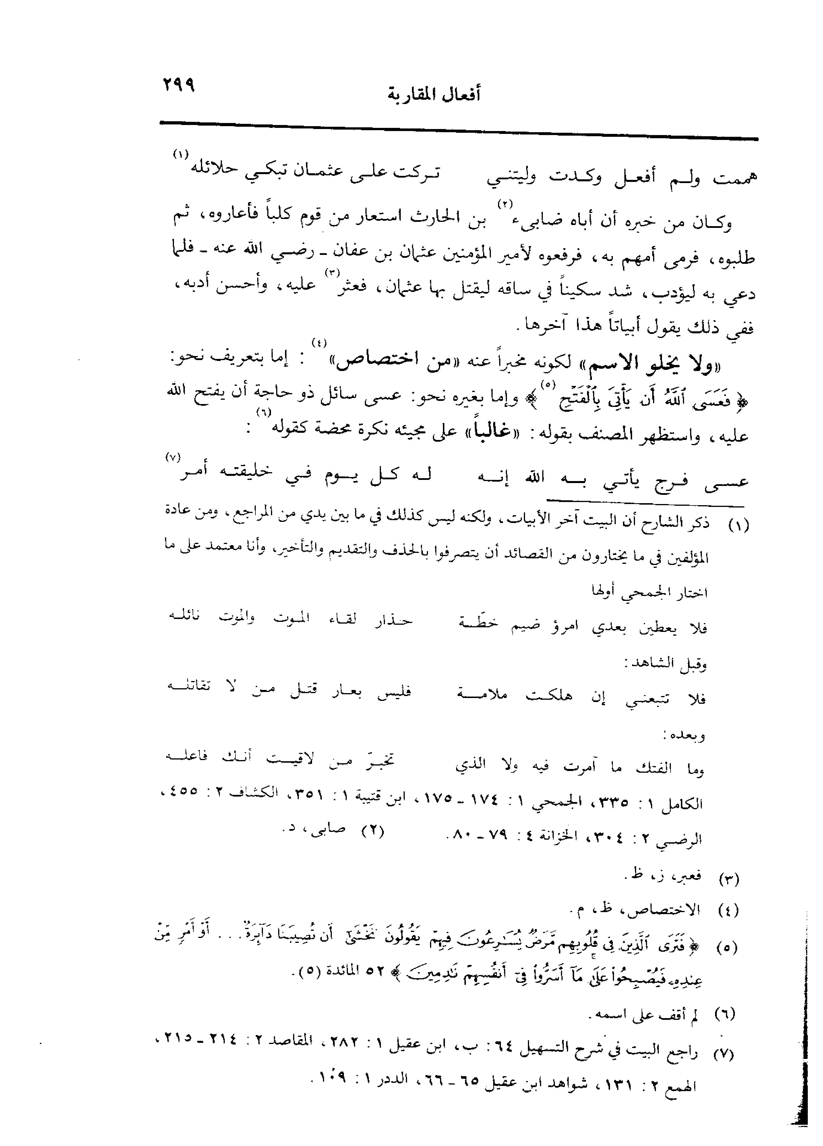 «ولا يخلو الاسم» لكونه مخبرًا عنه «من اختصاص»: إما بتعريف نحو: {فعسى الله أن يأتى بالفتح} وإما بغيره نحو: عسى سائل ذو حاجة أن يفتح الله عليه، واستظهر المصنف بقوله: «غالبًا» على مجيئه نكوة محضة كقوله: