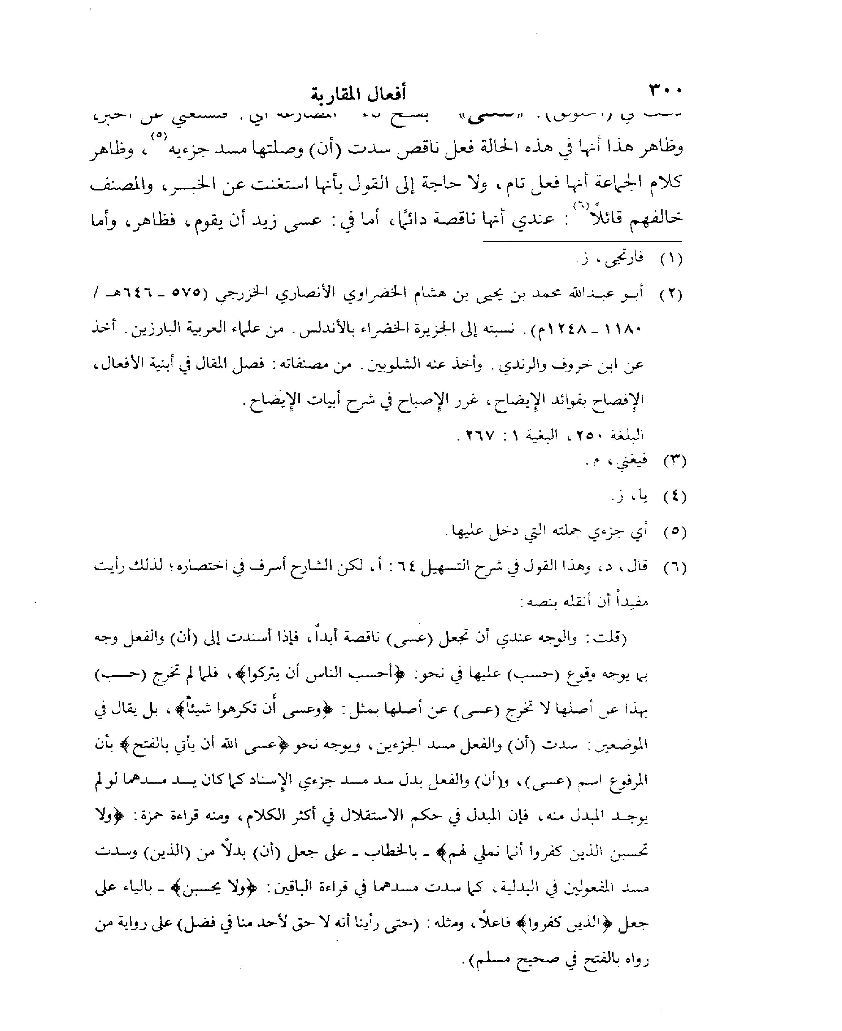 .......... المضارعة أي ..... عن الخبر، وظاهر هذا أنها في هذه الحالة فعل ناقص سدت (أن) وصلتها مسد جزءيه، وظاهر كلام الجماعة أنها فعل تام، ولا حاجة إلى القول بأنها استغنت عن الخبر، والمصنف خالفهم قائلًا: عندي أنها ناقصة دائمًا، أما في: عسى زيد أن يقوم، فظاهر، وأما