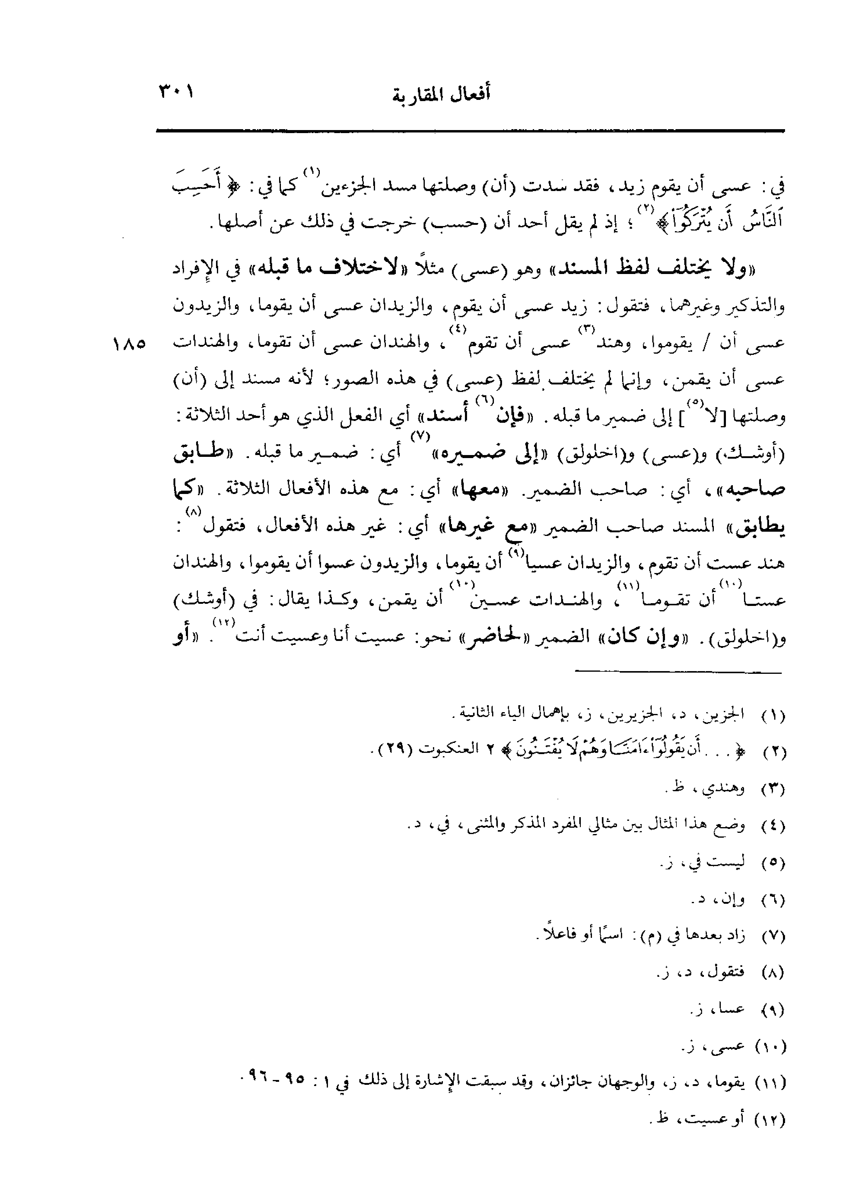 «ولا يختلف لفظ المسند» وهو (عسى) مثلًا «لاختلاف ما قبله» في الإِفراد والتذكير وغيرهما، فتقول: زيد عسى أن يقوم، والزيدان عسى أن يقوما، والزيدون عسى أن/ يقوموا، وهند عسى أن تقوم، والهندان عسى أن تقوما، والهندات عسى أن يقمن، وإنما لم يختلف لفظ (عسى) في هذه الصور؛ لأنه مسند إلى (أن) وصلتها [لا] إلى ضمير ما قبله. «فإن أسند» أي الفعل الذي هو أحد الثلاثة (أوشك) و (عسى) و (اخلولق) «إلى ضميره» أي: ضمير ما قبله. «طابق صاحبه»، أي صاحب الضمير. «معها» أي: مع هذه الأفعال الثلاثة. «كما يطابق» المسند صاحب الضمير «مع غيرها» أي: غير هذه الأفعال، فتقول: هند عست أن تقوم، والزيدان عسيا أن يقوما، والزيدون عسوا أن يقوموا، والهندان عستا أن تقوما، والهندات عسين أن يقمن، وكذا يقال: في (أوشك) و (اخلولق). «أو كان» الضمير «الحاضر» نحو: عسيت أنا وعسيت أنت. «أو